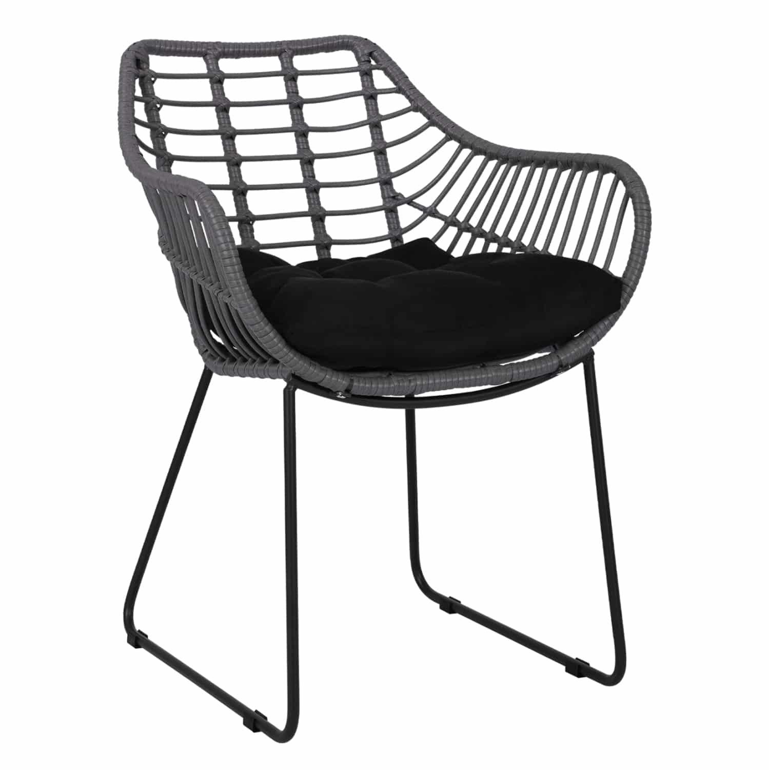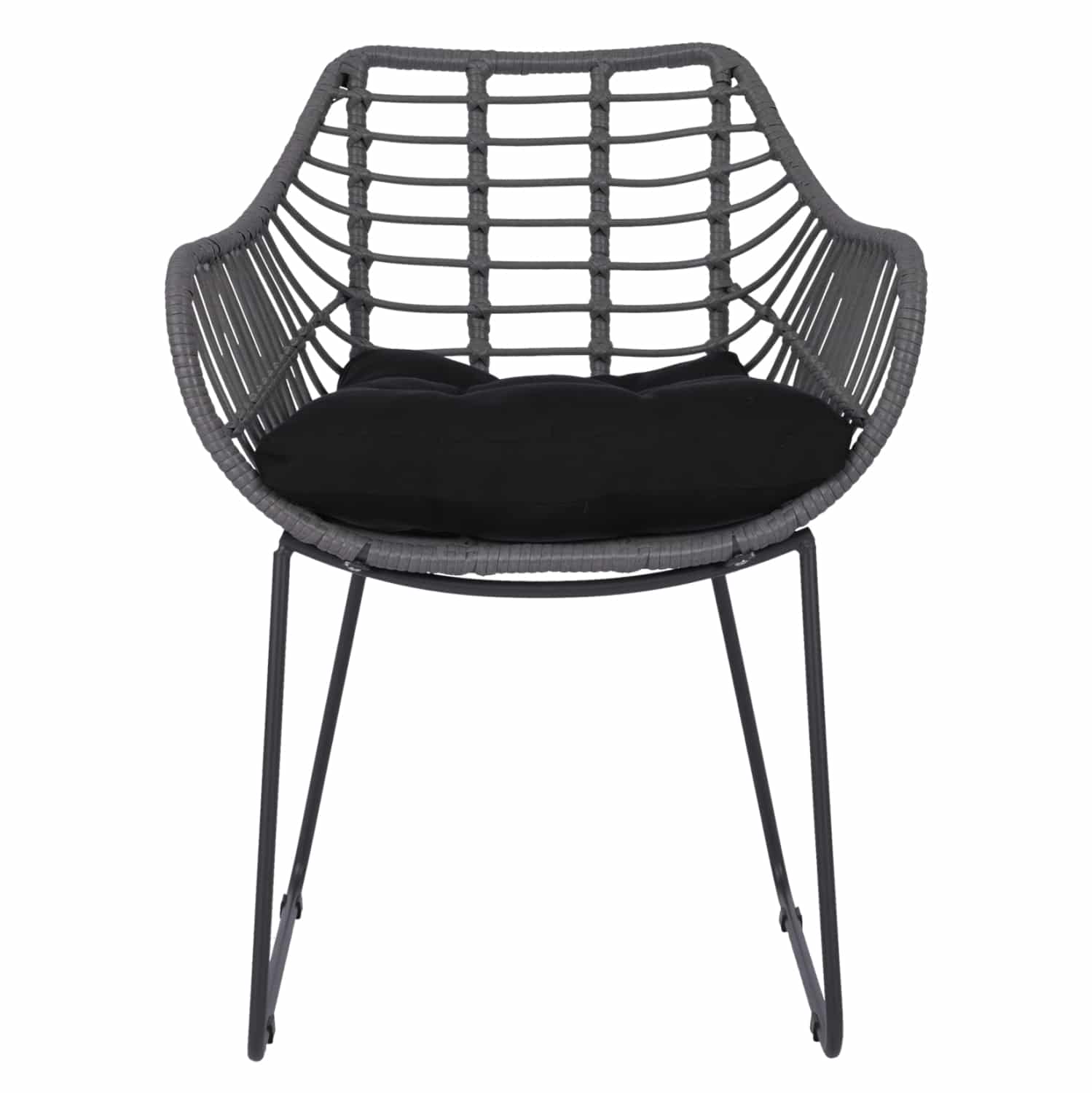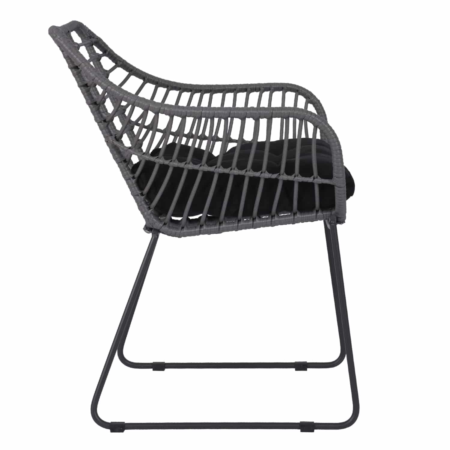 Μοντέρνα πολυθρόνα εξωτερικού χώρου, κατασκευασμένη από μεταλλικό μασίφ σκελετό σε μαύρη απόχρωση και επενδυμένη με πλεκτό wicker σε γκρι μόκα απόχρωση.