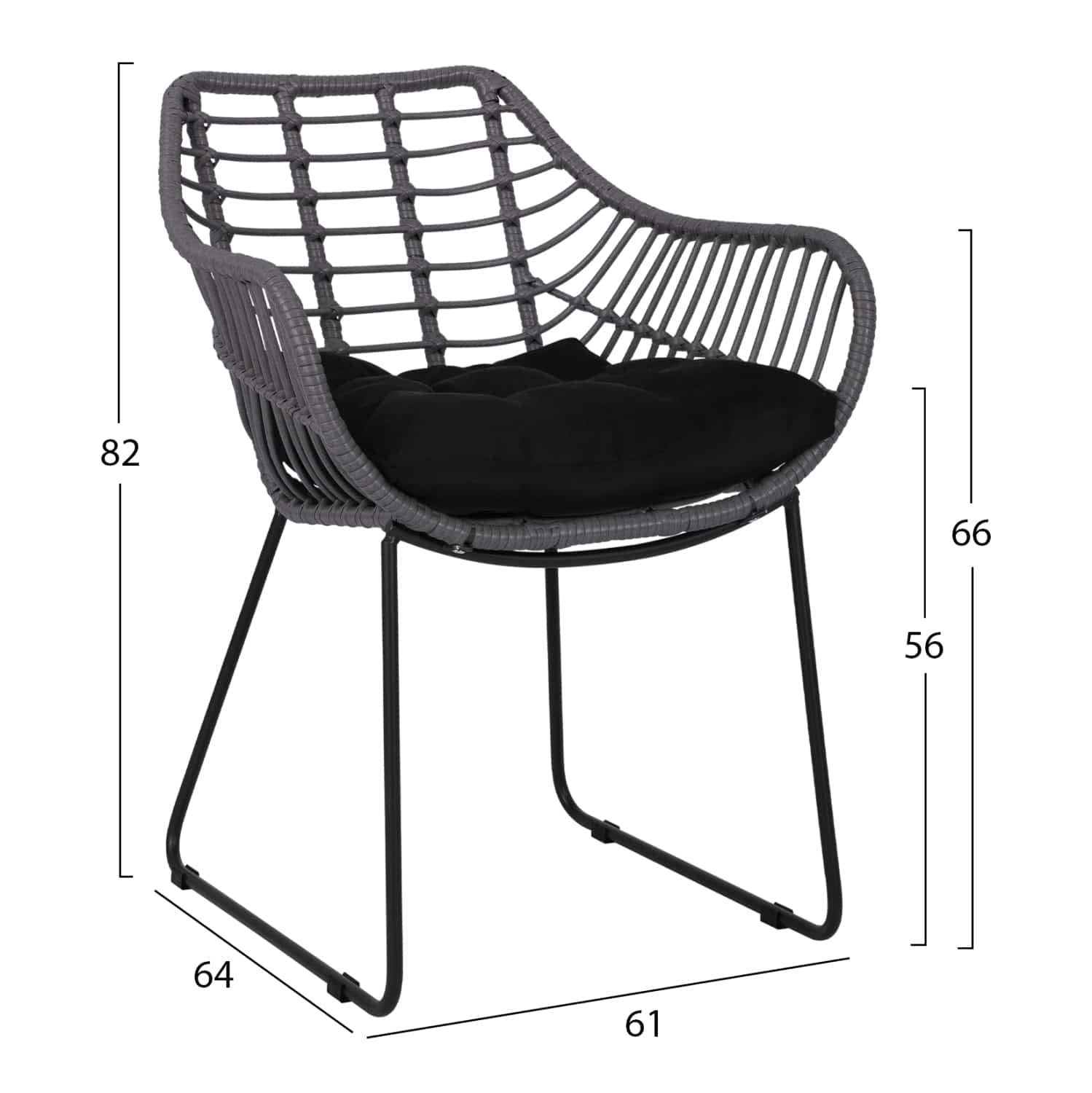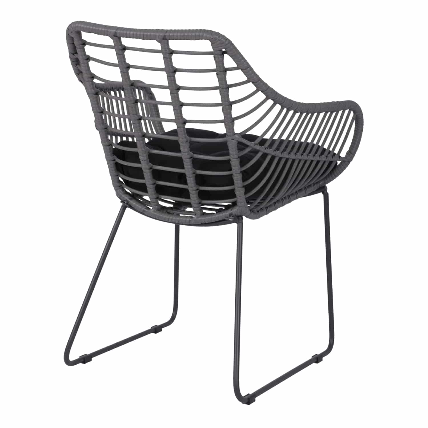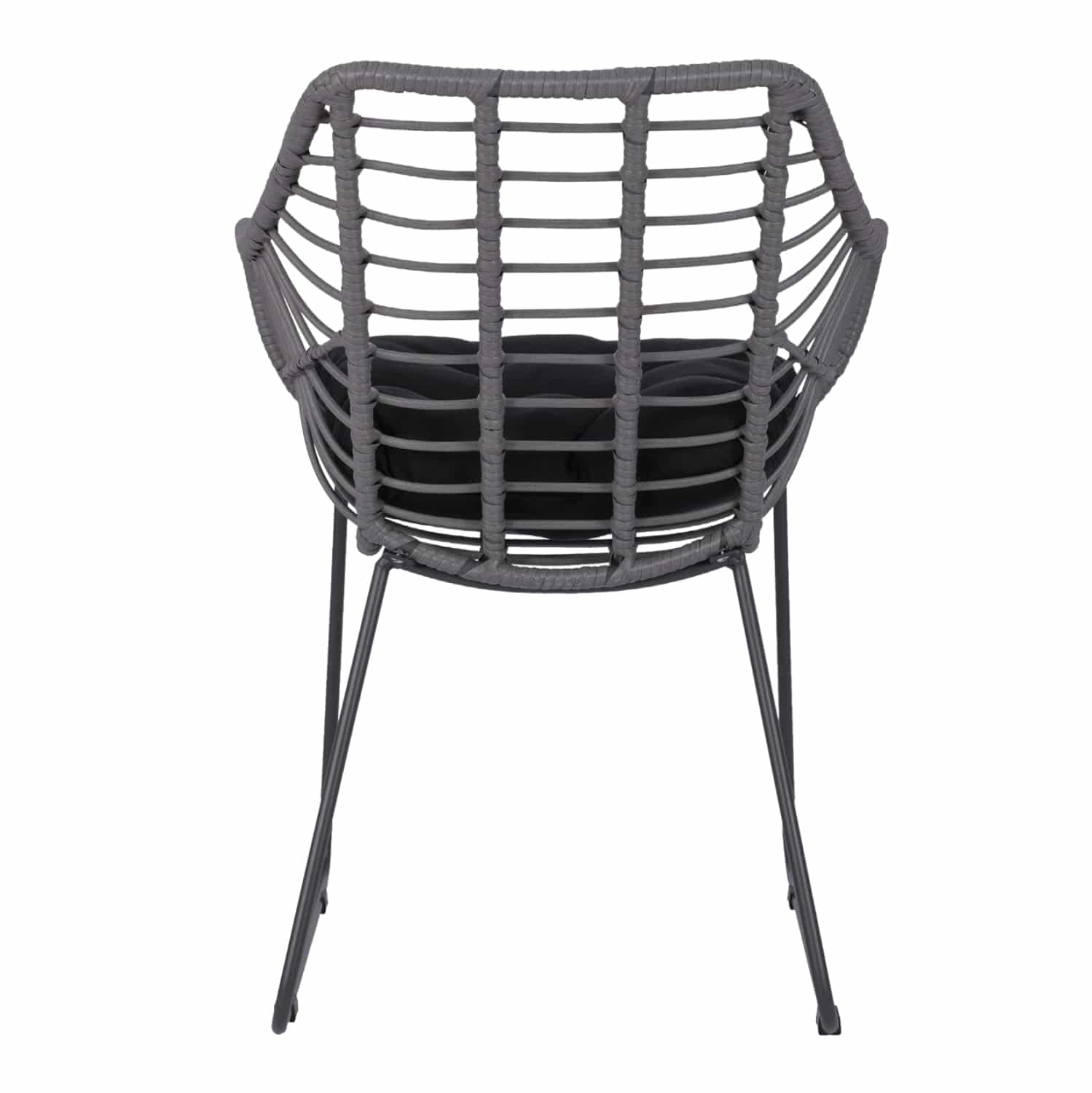 Μοντέρνα πολυθρόνα εξωτερικού χώρου, κατασκευασμένη από μεταλλικό μασίφ σκελετό σε μαύρη απόχρωση και επενδυμένη με πλεκτό wicker σε γκρι μόκα απόχρωση.