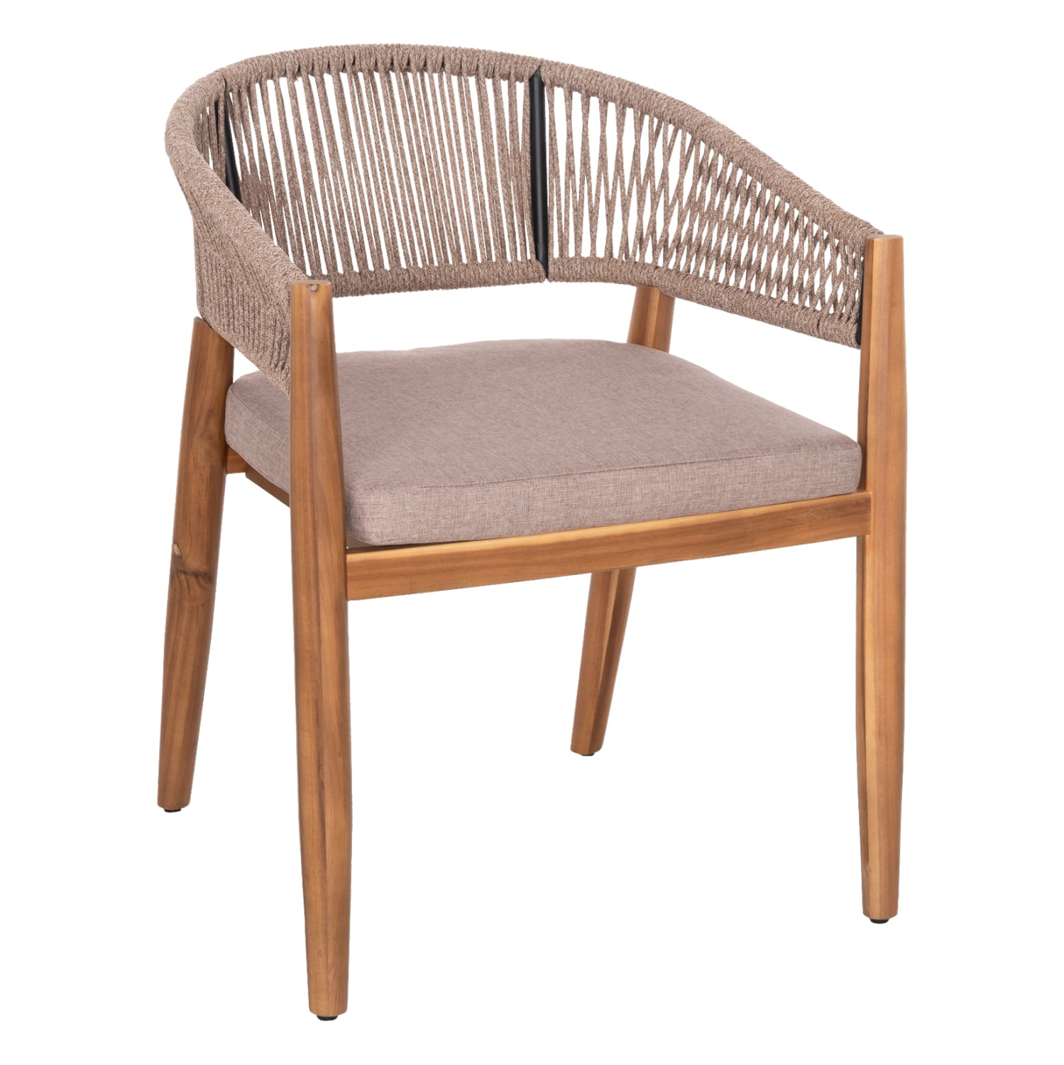 Η πολυθρόνα τραπεζαρίας εξωτερικού χώρου NAVAN συνδυάζει αρμονικά διαφορετικά υλικά κατασκευής. Τα πόδια είναι από ξύλο ακακίας στο ΦΥΣΙΚΟ του χρώμα, ενώ ο σκελετός της πλάτης είναι μεταλλικός με πλέξη από nylon σχοινί σε ΜΠΕΖ χρώμα. Το κάθισμα διαθέτει μαξιλάρι με πολυεστερικό ύφασμα επίσης σε ΜΠΕΖ χρώμα. Οι σχεδιαστικές γραμμές είναι κομψές και με γνώμονα την άνεση του χρήστη και θα αποτελέσει το κέντρο ενδιαφέροντος οπουδήποτε και αν τοποθετηθεί, ιδιαίτερα όμως αν συνδυαστεί με το ανάλογο τραπέζι.