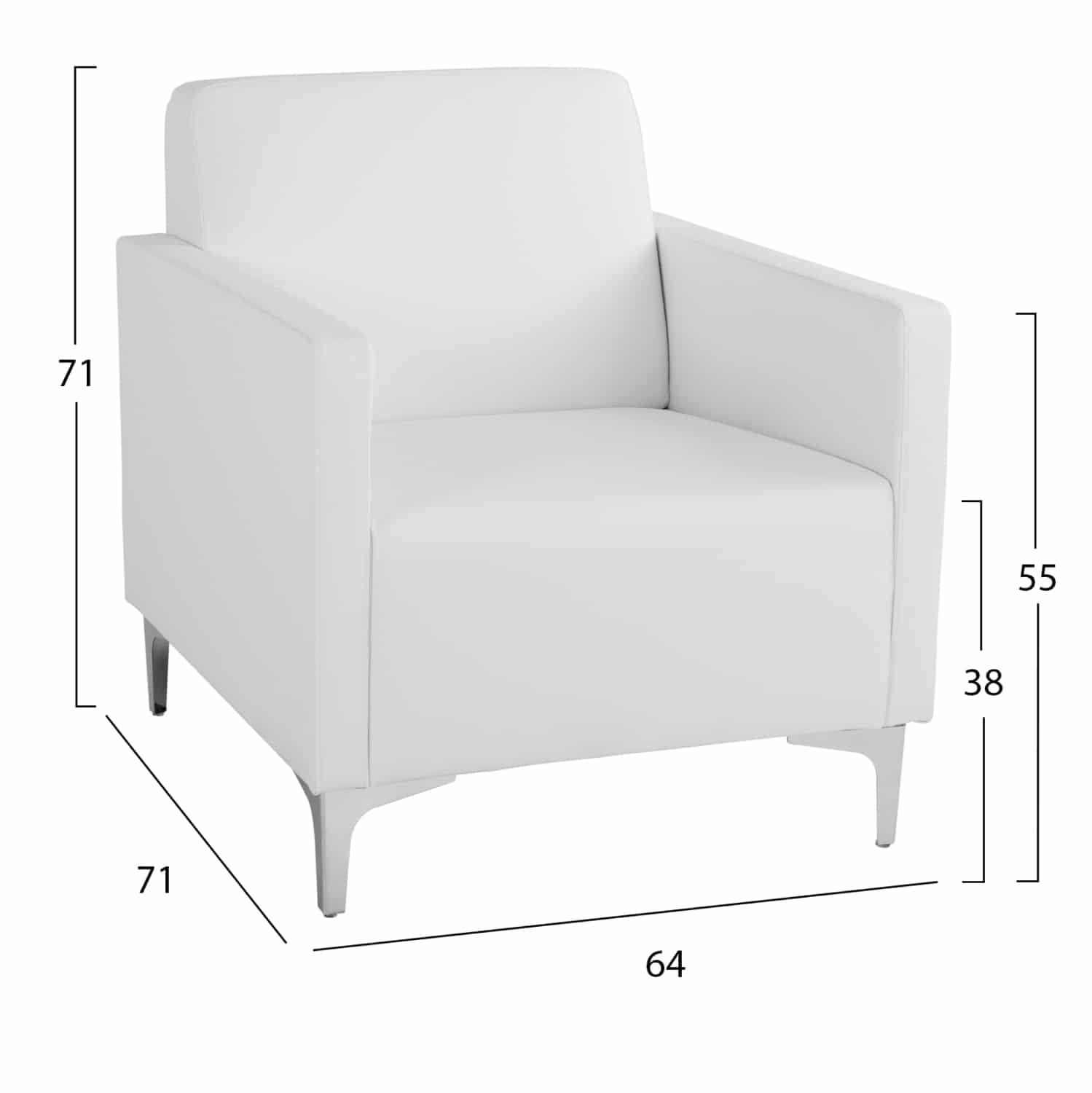 Η πολυθρόνα ΗΜ3159.12 σε ΛΕΥΚΟ χρώμα με μεταλλικά πόδια στις 4 γωνίες σε ασημί χρώμα είναι λιτή και πρακτική. Το χαρακτηριστικό που κάνει αυτή την πολυθρόνα να ξεχωρίζει είναι η στιβαρότητά της με τα ψηλά μπράτσα, πράγμα που δίνει την αίσθηση κύρους και πολυτέλειας οπουδήποτε κι αν χρησιμοποιηθεί, σε συνδυασμό με το εντυπωσιακό στην όψη PU leather. Το μαξιλάρι του καθίσματος είναι αναπαυτικό όπως και το μαξιλάρι της πλάτης που είναι ψηλότερο από την ίδια την πλάτη, προσφέροντας μεγαλύτερη άνεση στον χρήστη.