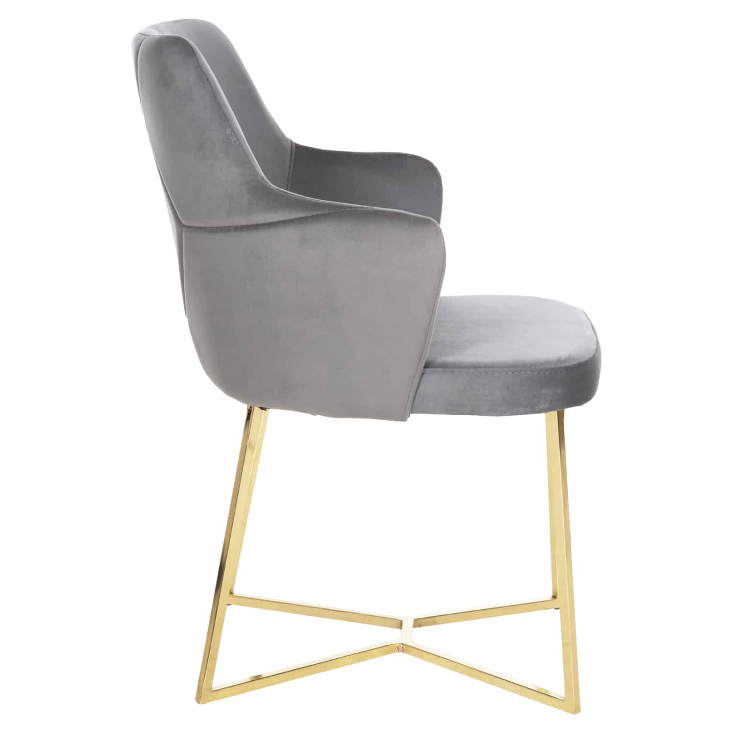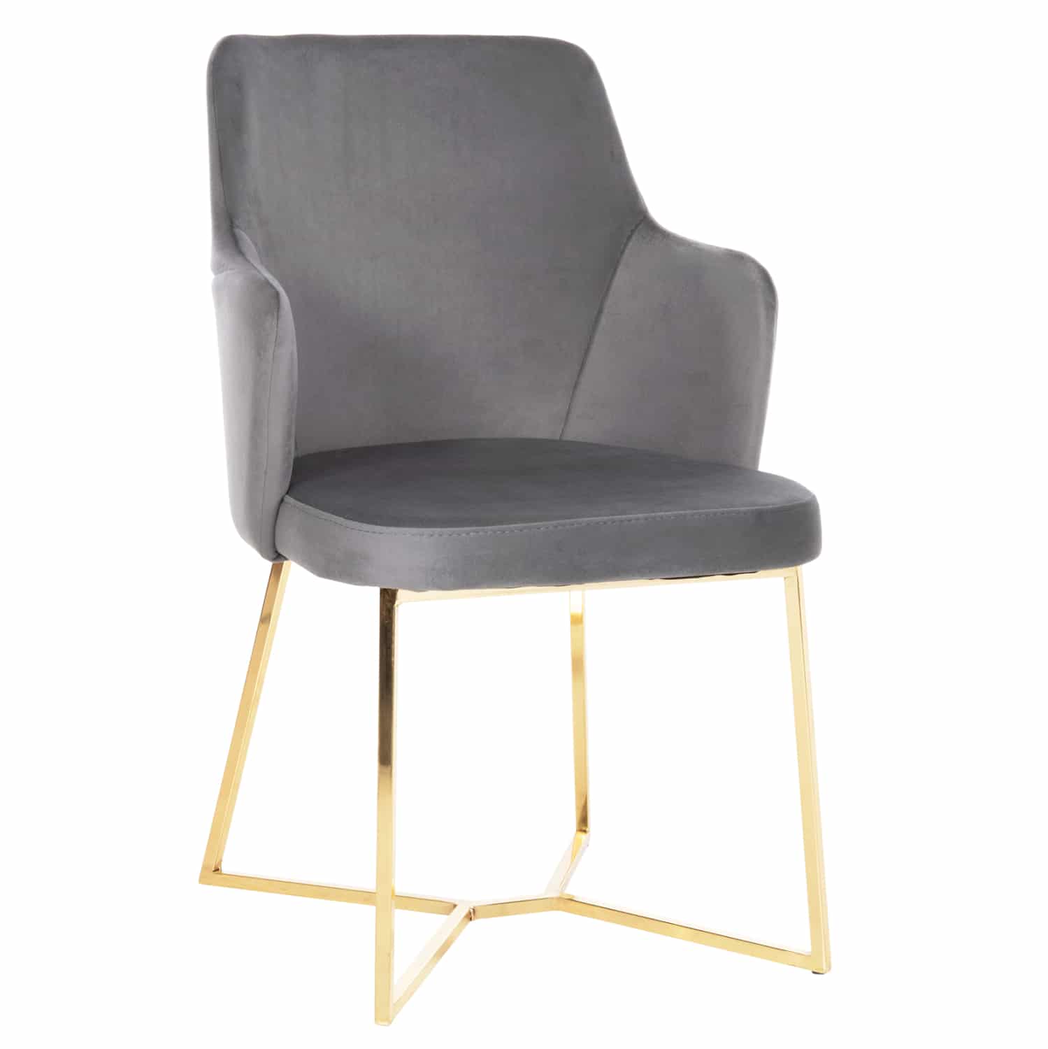 Πολυθρόνα TRIANA σε ΓΚΡΙ χρώμα με ΧΡΥΣΑ μεταλλικά πόδια. Τα 4 μεταλλικά πόδια συνδέονται μεταξύ τους με μια χιαστί διάταξη στο κάτω μέρος. Μια πολυθρόνα που δίνει κάτι το ξεχωριστό σε οποιοδήποτε επαγγελματικό χώρο. Λιτή, ποιοτική και κομψή σίγουρα θα τραβήξει τα βλέμματα. Το εξωτερικό της μεσαίου ύψους πλάτης φέρει γεωμετρικές ραφές στην βελούδινη επένδυση, πράγμα που επιτείνει τον ιδιαίτερο χαρακτήρα αυτής της πολυθρόνας. Ιδανική επιλογή για επαγγελματικούς χώρους και κυρίως για χώρους ξενοδοχείων, εστίασης, AirBnB κτλ, στους οποίους η αισθητική υπεροχή του βελούδου θα κάνει την διαφορά.
