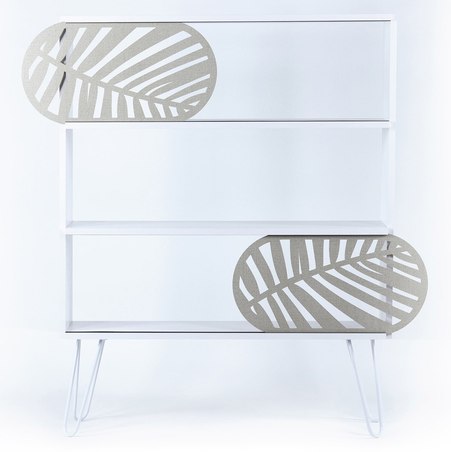 Ραφιέρα δαπέδου με συρόμενα πορτάκια σε λευκή απόχρωση με λεπτομέρειες σε εκρού χρώμα.