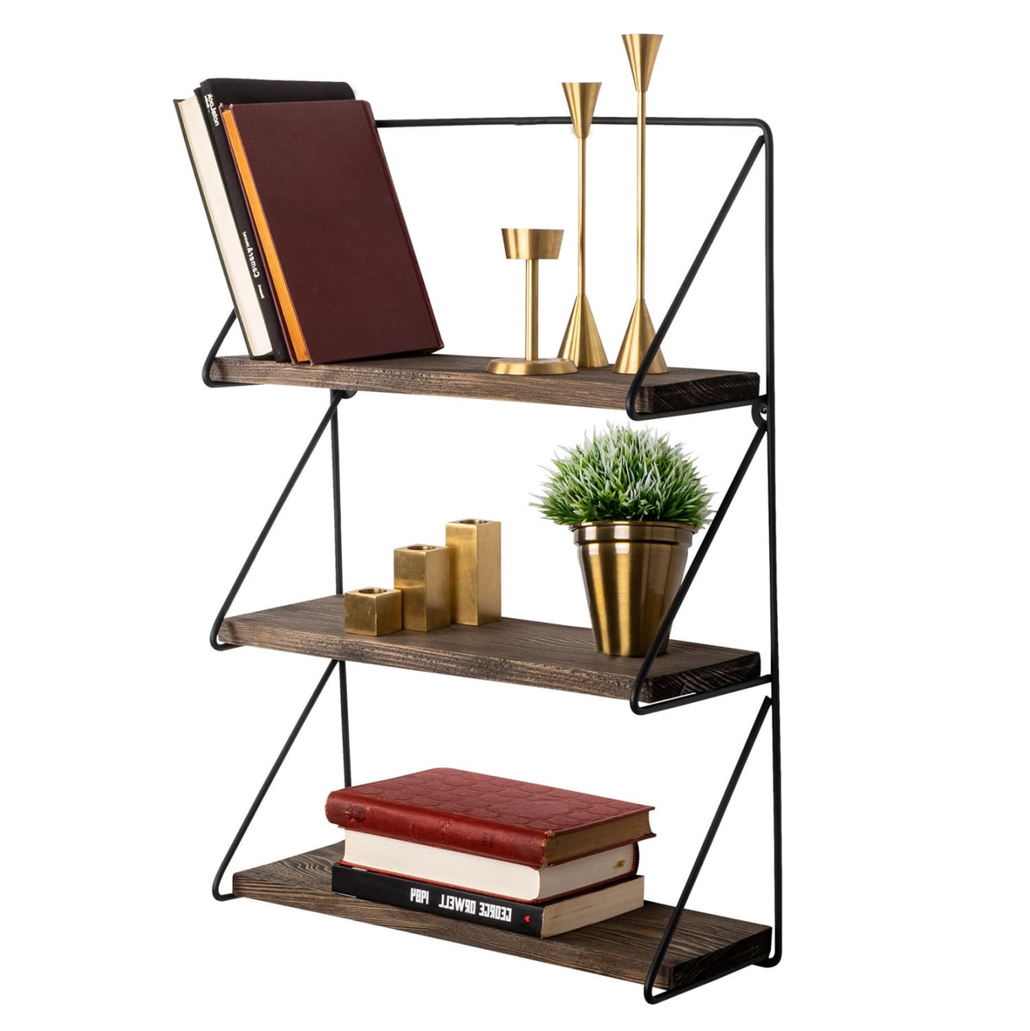 Ραφιέρα τοίχου από μεταλλικό σκελετό σε μαύρη απόχρωση και ξύλινη βάση σε καρυδί απόχρωση.