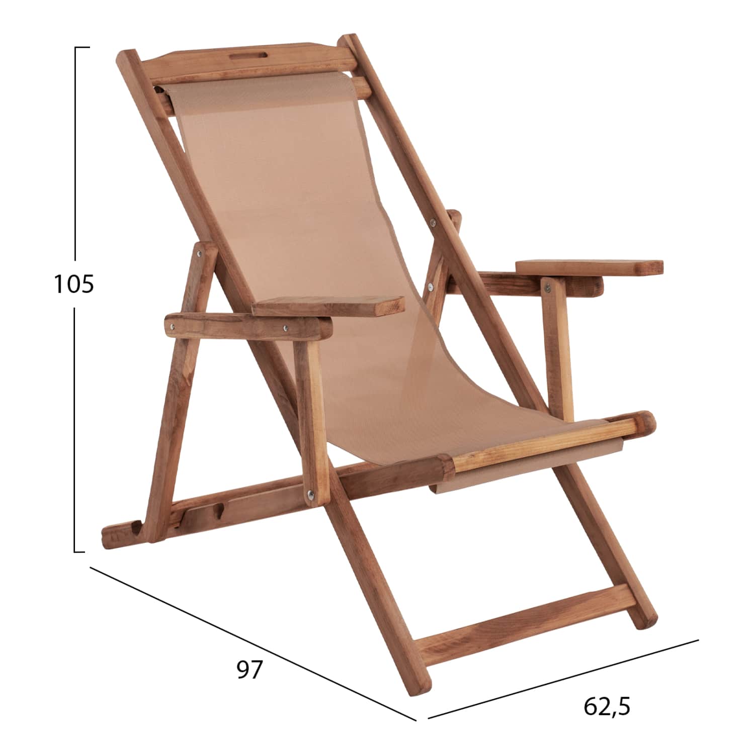 Η ξύλινη σεζλόνγκ παραλίας με μπράτσα ΛΗΜΝΟΣ σε ΚΑΡΥΔΙ χρώμα εμποτισμού είναι μια μοντέρνα και πολυτελής πρόταση για την παραλία. Η ξύλινη κατασκευή της την κάνει απίστευτα ανθεκτική και στιβαρή και το ΜΟΚΑ textilene πανί ταιριάζει όμορφα με τον ΚΑΡΥΔΙ σκελετό. Η σκαλιέρα έχει 3 θέσεις ανάκλισης προσφέροντας την πολυπόθητη άνεση που αναζητάτε στην παραλία.
