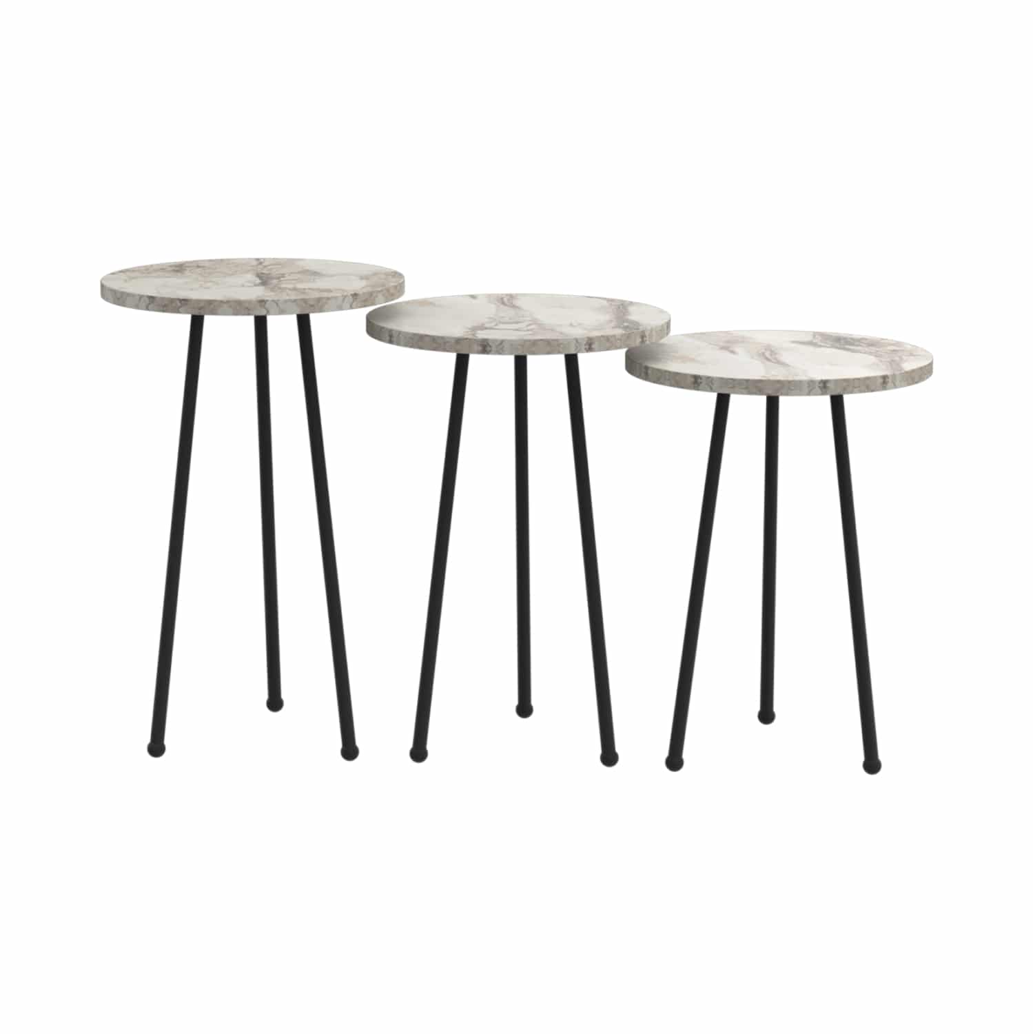 Τα 3 βοηθητικά στρογγυλά τραπεζάκια ΚISSA ήρθαν για να κλέψουν την παράσταση με το στυλ και την πρακτικότητά τους. Η επιφάνειά τους είναι από μελαμίνη 18mm σε όψη ΛΕΥΚΟΥ ΜΑΡΜΑΡΟΥ, ενώ τα πόδια τους είναι συμπαγή μεταλλικά σε ΜΑΥΡΟ χρώμα. Το χαρακτηριστικό τους είναι ότι έρχονται σε 3 διαφορετικά ύψη εξυπηρετώντας κάθε ανάγκη στον χώρο του σαλονιού.