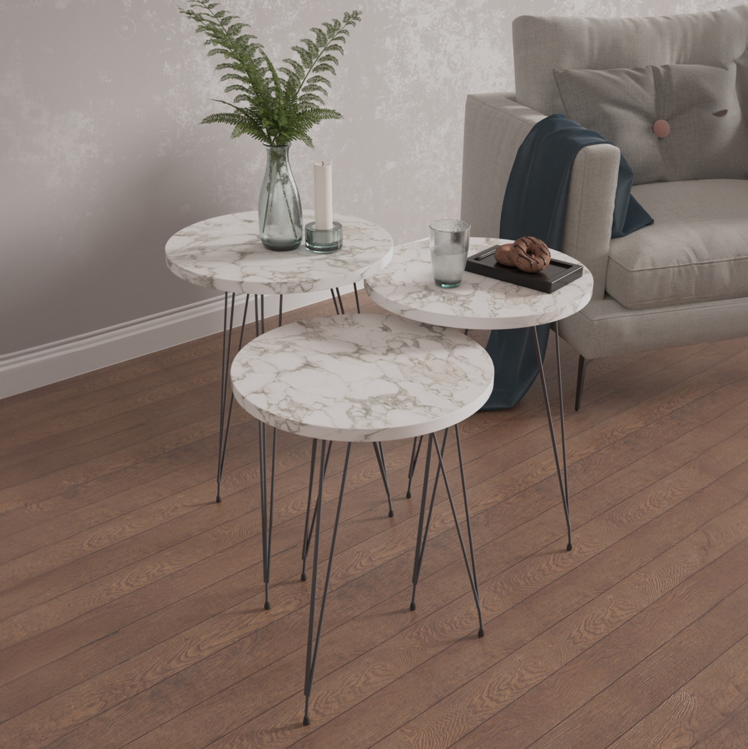 Τα 3 βοηθητικά στρογγυλά τραπεζάκια NISSA ήρθαν για να κλέψουν την παράσταση με το στυλ και την πρακτικότητά τους. Η επιφάνειά τους είναι από μελαμίνη 18mm σε όψη ΛΕΥΚΟΥ ΜΑΡΜΑΡΟΥ, ενώ τα πόδια τους είναι μεταλλικά σε ΜΑΥΡΟ χρώμα. Το χαρακτηριστικό τους είναι ότι έρχονται σε 3 διαφορετικά ύψη εξυπηρετώντας κάθε ανάγκη στον χώρο του σαλονιού.