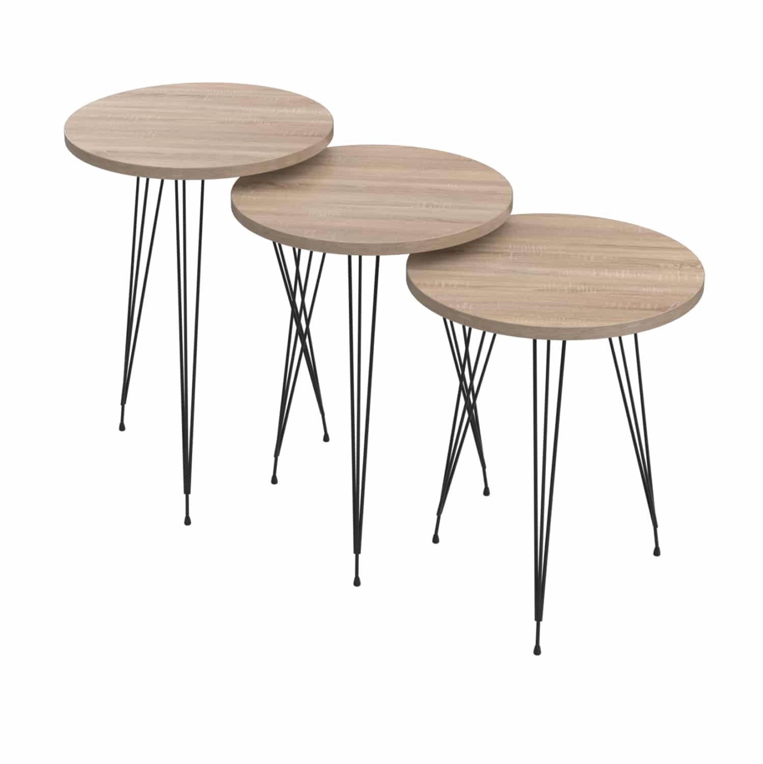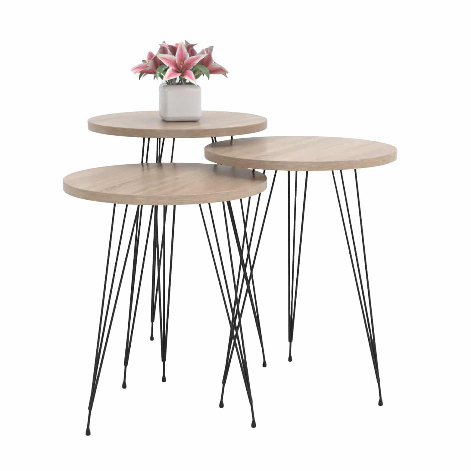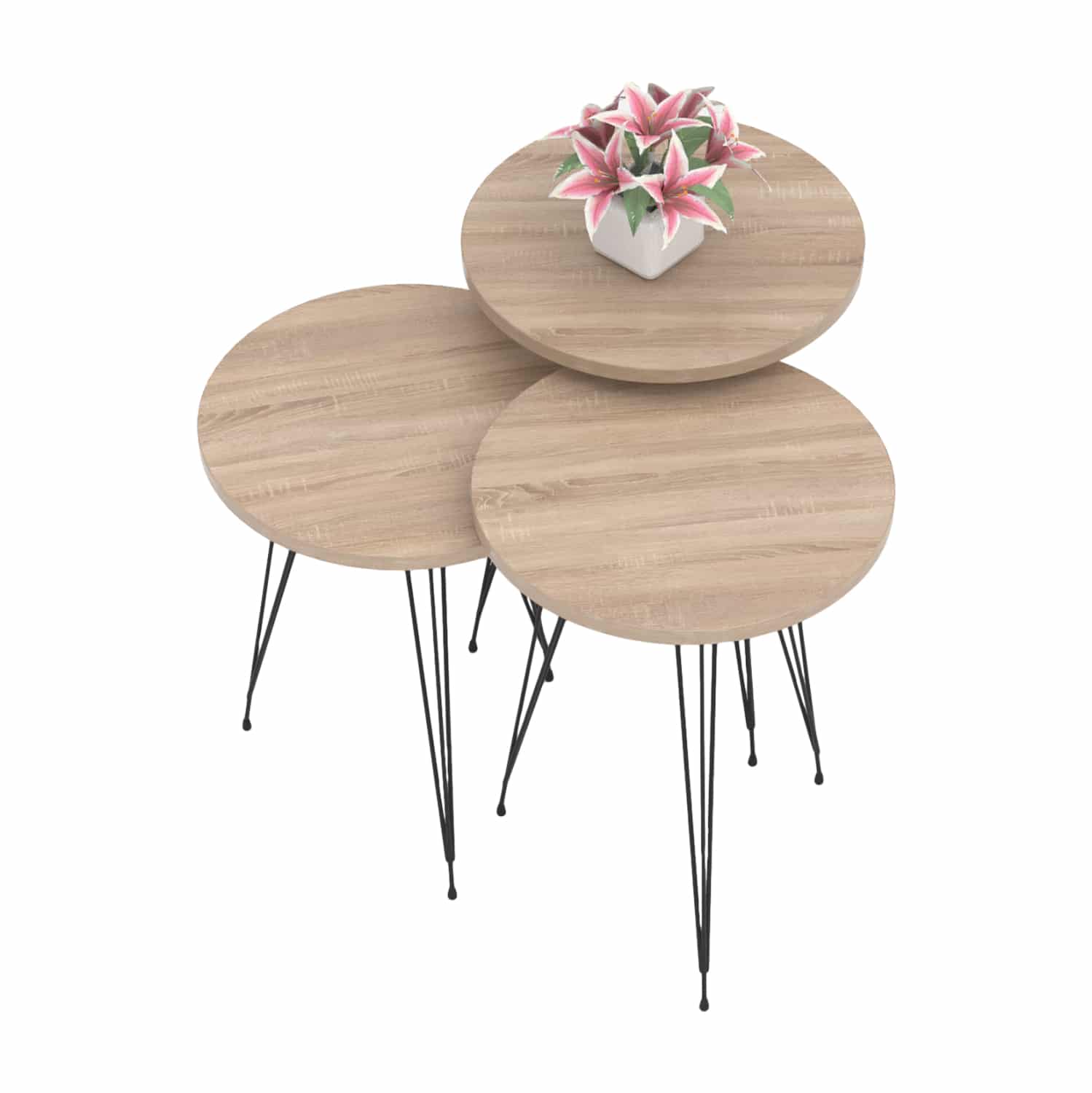 Τα 3 βοηθητικά στρογγυλά τραπεζάκια NISSA ήρθαν για να κλέψουν την παράσταση με το στυλ και την πρακτικότητά τους. Η επιφάνειά τους είναι από μελαμίνη 18mm σε χρώμα ΣΟΝΑΜΑ, ενώ τα πόδια τους είναι μεταλλικά σε ΜΑΥΡΟ χρώμα. Το χαρακτηριστικό τους είναι ότι έρχονται σε 3 διαφορετικά ύψη εξυπηρετώντας κάθε ανάγκη στον χώρο του σαλονιού.