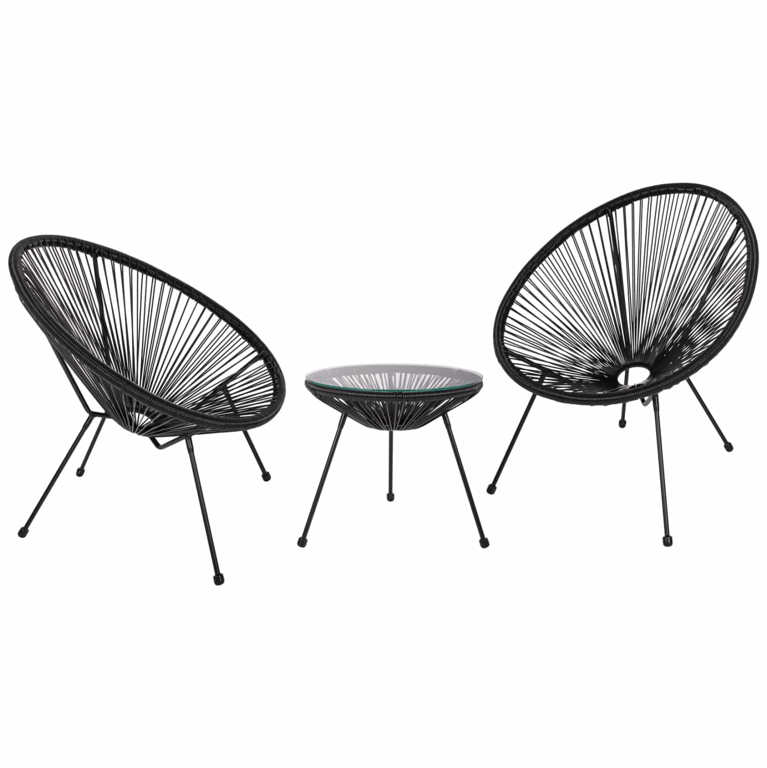 Το ACAPULCO είναι ένα σετ σαλονιού εξωτερικού χώρου σε εξολοκλήρου ΜΑΥΡΟ χρώμα, με στρογγυλό τραπεζάκι με γυάλινη επιφάνεια και 2 αναπαυτικές πολυθρόνες τύπου φωλιάς! Η επένδυση σε όλο το σετ είναι από P.E.RATTAN επάνω σε μαύρους μεταλλικούς σκελετούς. Το Wicker δεν είναι υλικό, είναι μέθοδος κατασκευής επίπλων κυρίως για εξωτερικούς χώρους, με βασικό υλικό το συνθετικό Rattan.