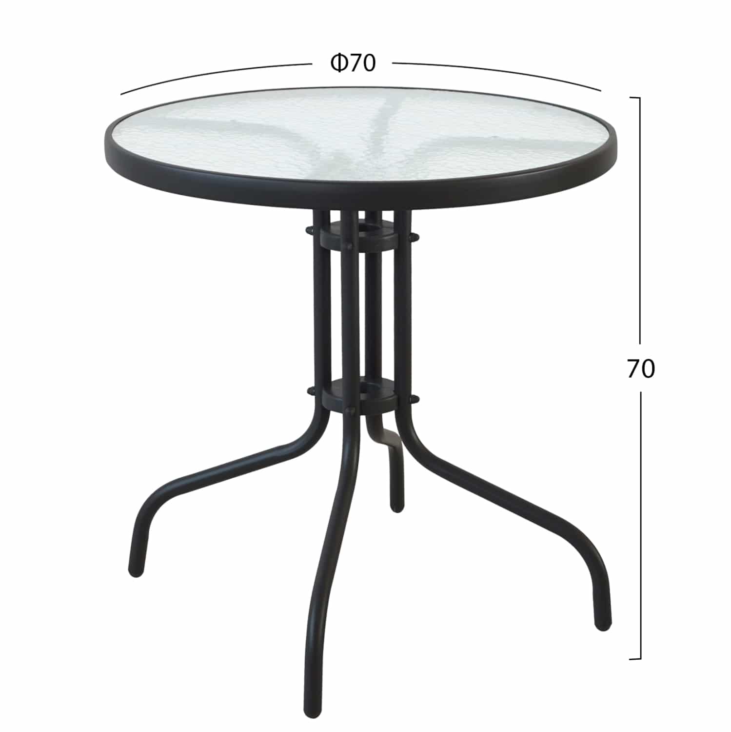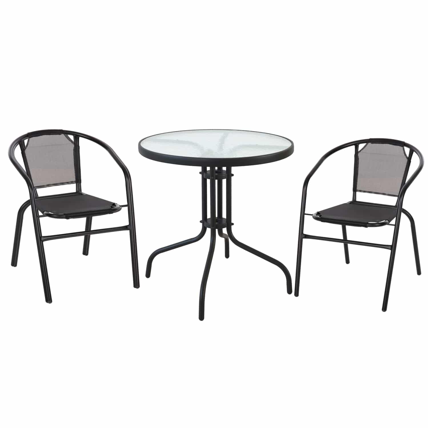 Αυτό το σετ αποτελείται από 2 ΜΑΥΡΕΣ μεταλλικές καρέκλες με textilene στην πλάτη και το κάθισμα, κι ένα στρογγυλό τραπέζι σε ΜΑΥΡΟ χρώμα, με επιφάνεια από ημιδιάφανο γυαλί ασφαλείας. Η γυάλινη επιφάνεια στηρίζεται σε μια μεταλλική κολώνα με 4 πόδια με όμορφη καμπυλωτή διάταξη. Οι καρέκλες είναι ελαφριές και γενικά το σετ αυτό είναι ιδανικό για περιορισμένους χώρους, όπως μπαλκόνια και μικρές αυλές.