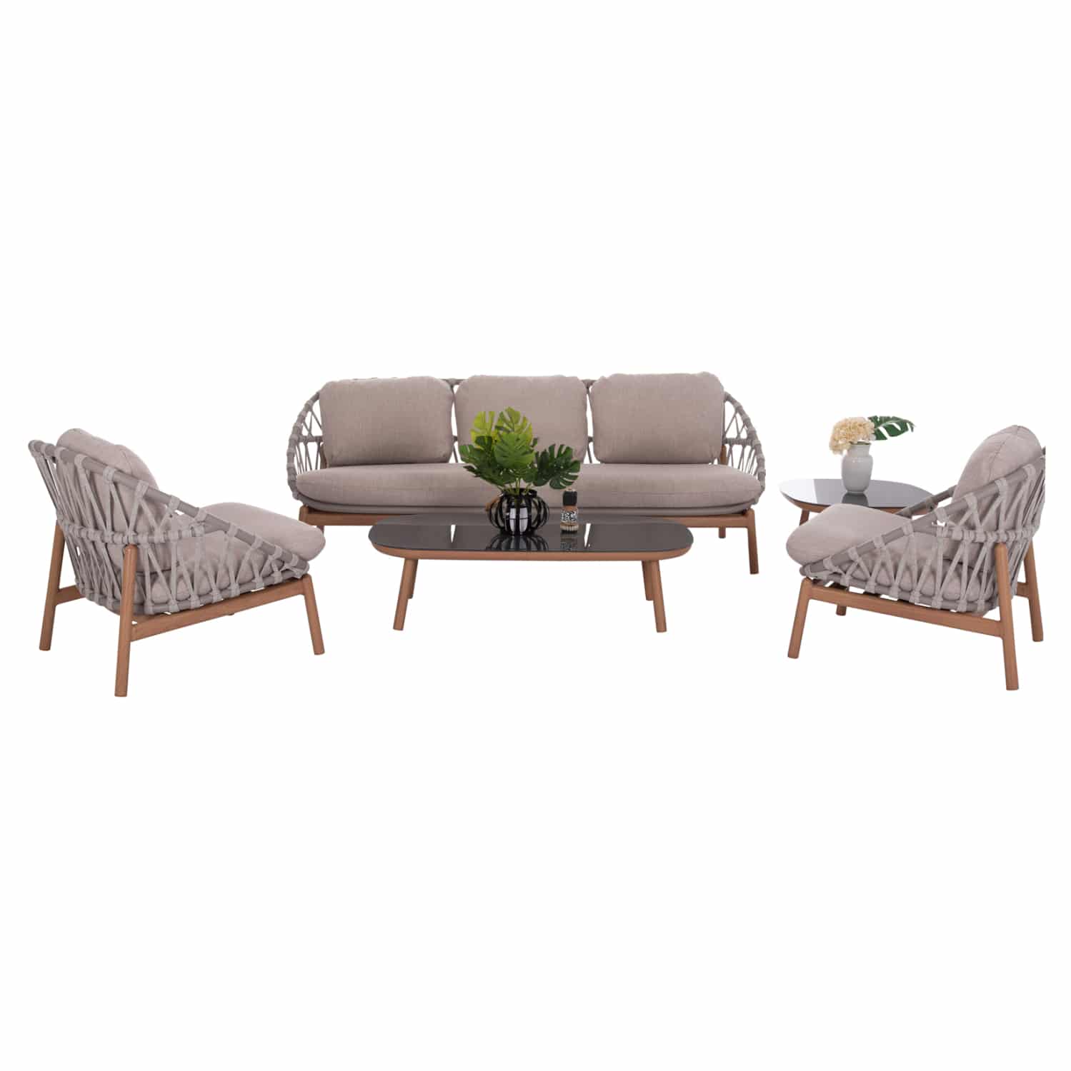 Το KROM είναι ένα σαλόνι εξωτερικού χώρου που αποτελείται από έναν 3-θέσιο καναπέ, 2 αναπαυτικές πολυθρόνες, και δύο τραπεζάκια (ένα ορθογώνιο κι ένα τετράγωνο). Τα πόδια είναι από αλουμίνιο σε χρώμα ξύλου με μαξιλάρια σε ανοιχτό ΓΚΡΙ χρώμα. Σε όλο το σετ η επένδυση στον γκρι αλουμινένιο σκελετό έχει γίνει με πολυεστερικό σχοινί strap, ενώ το top στα τραπεζάκια από 3D printed γυαλί σε σκούρο ΓΚΡΙ χρώμα, απογειώνει ποιοτικά όλη την σύνθεση!