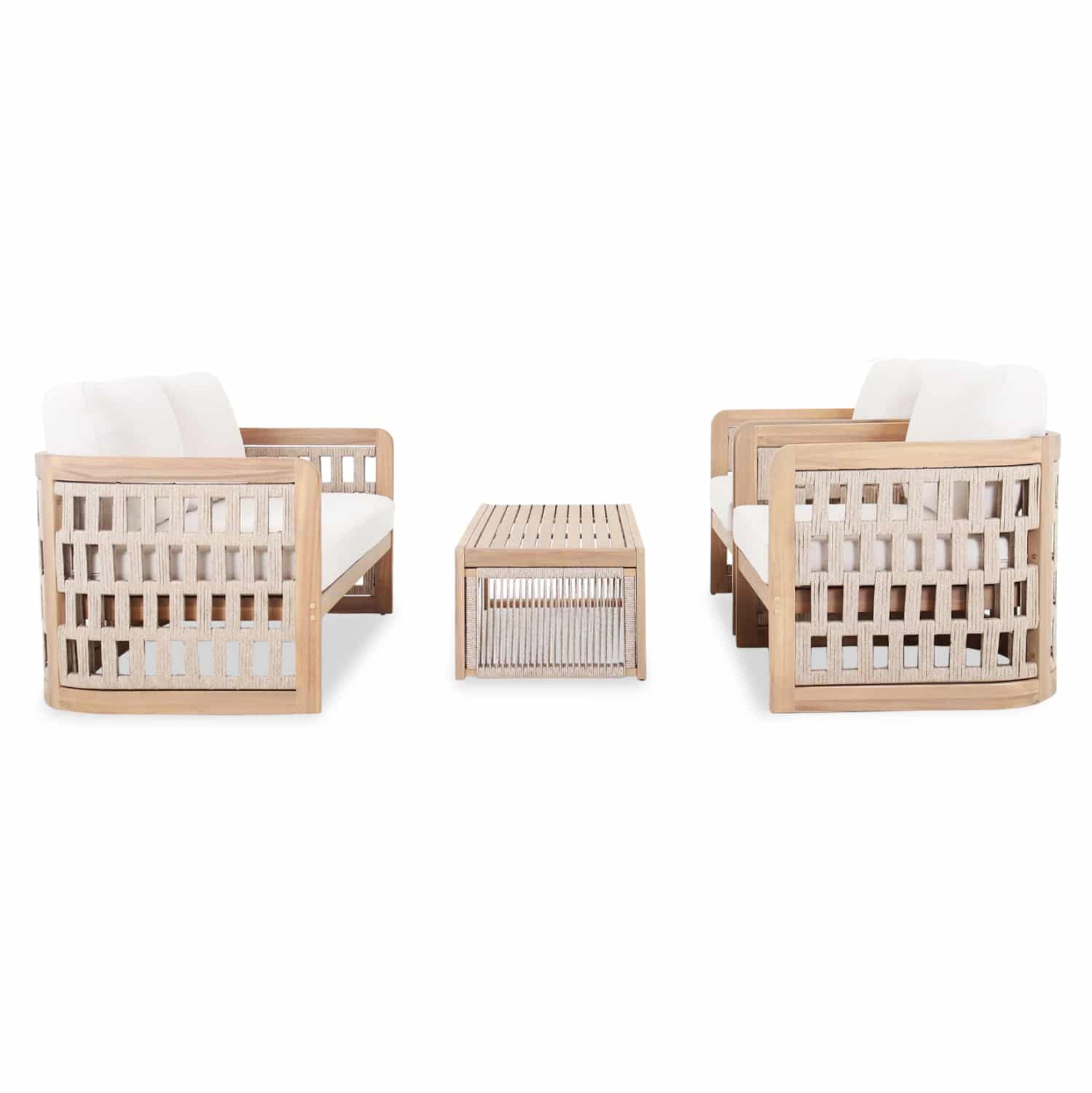 Το σετ σαλόνι εξωτερικού χώρου 4τμχ LUDVALD αποτελείται από έναν 3-θέσιο καναπέ και 2 πολυθρόνες με ημικυκλικό σκελετό επενδυμένο με σχοινί, και ένα ορθογώνιο τραπεζάκι. Ο σκελετός είναι από ξύλο ακακίας σε ΦΥΣΙΚΟ χρώμα με μαξιλάρια σε ΜΠΕΖ χρώμα, ένας συνδυασμός γήινων χρωμάτων που δίνει μια «ζεστή» εικόνα στο σύνολο.
