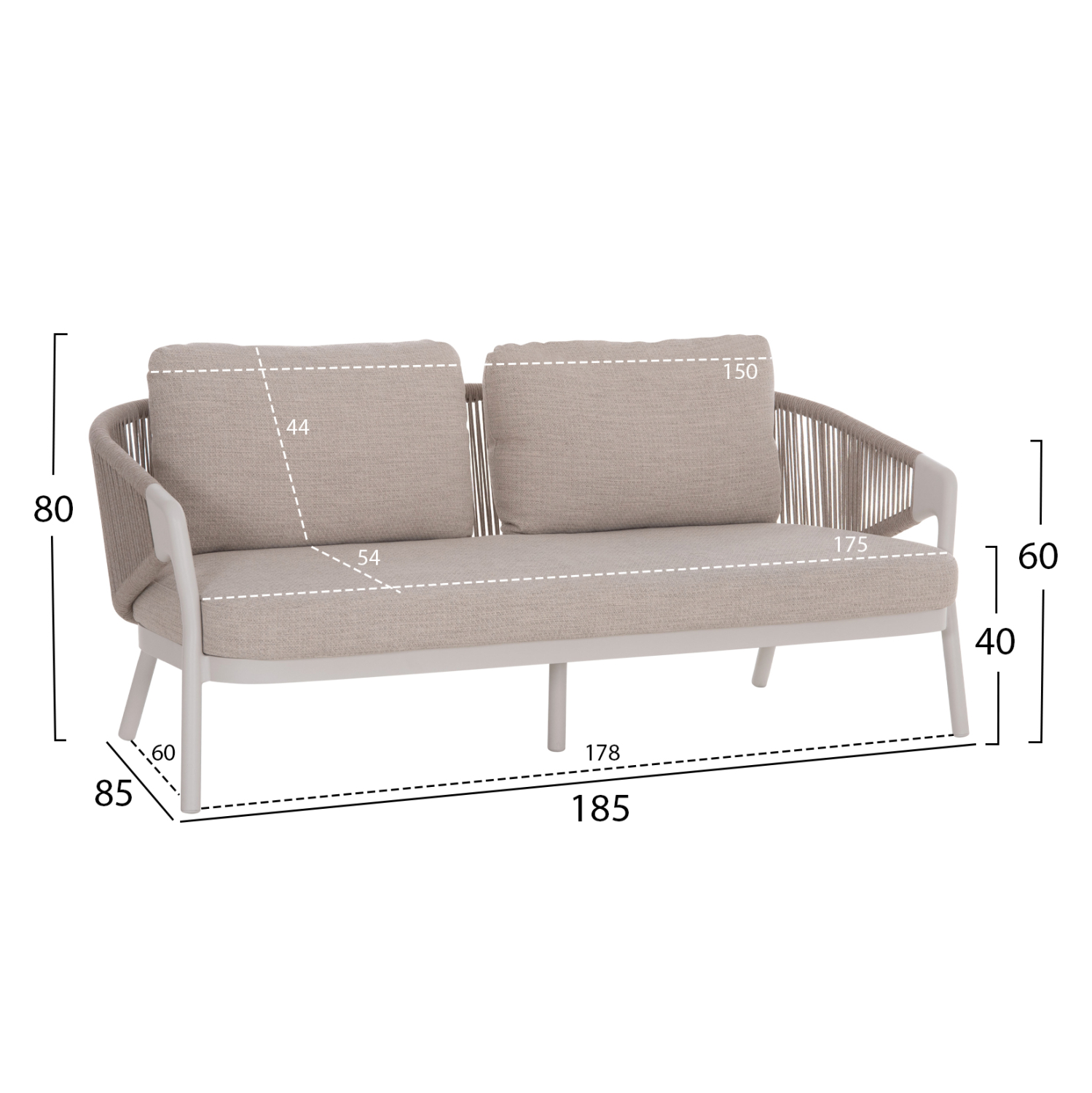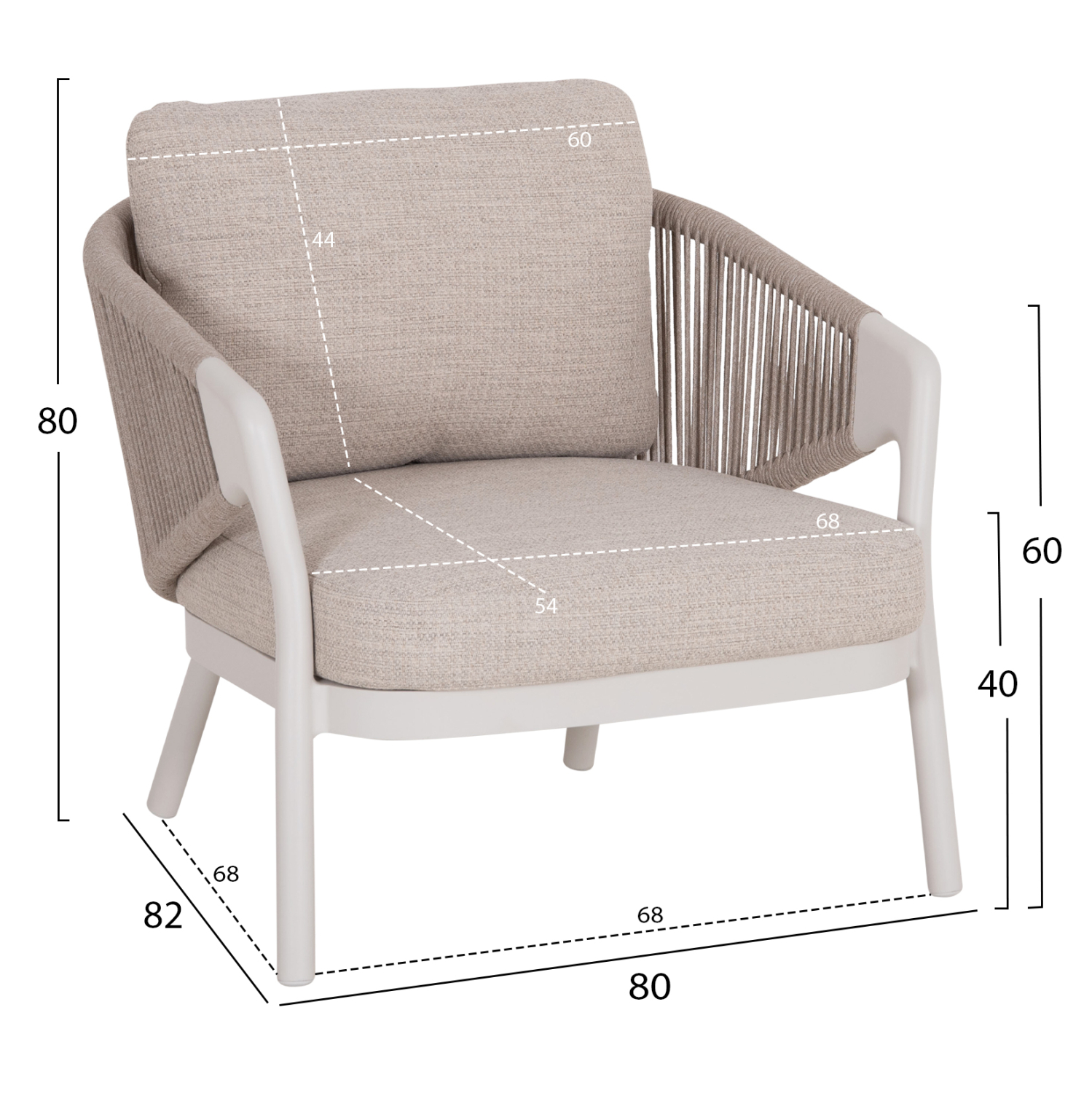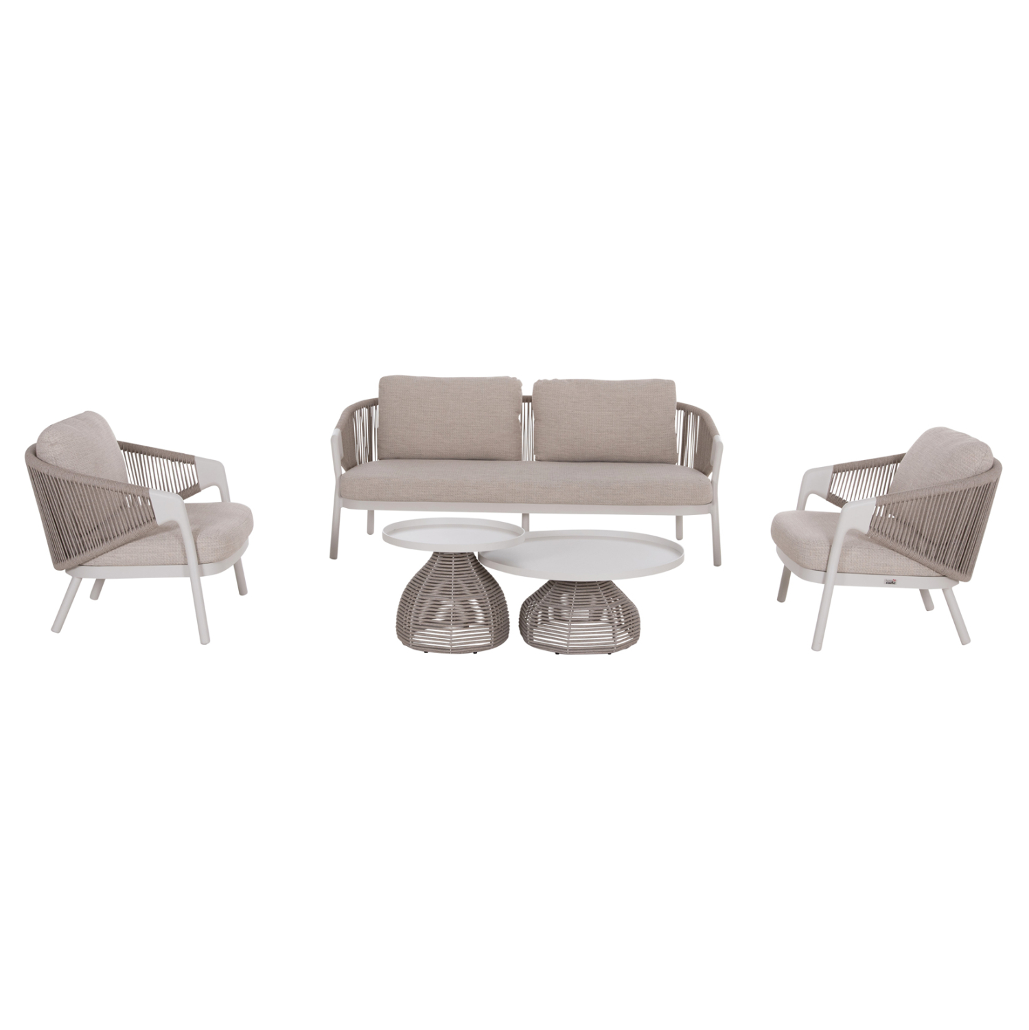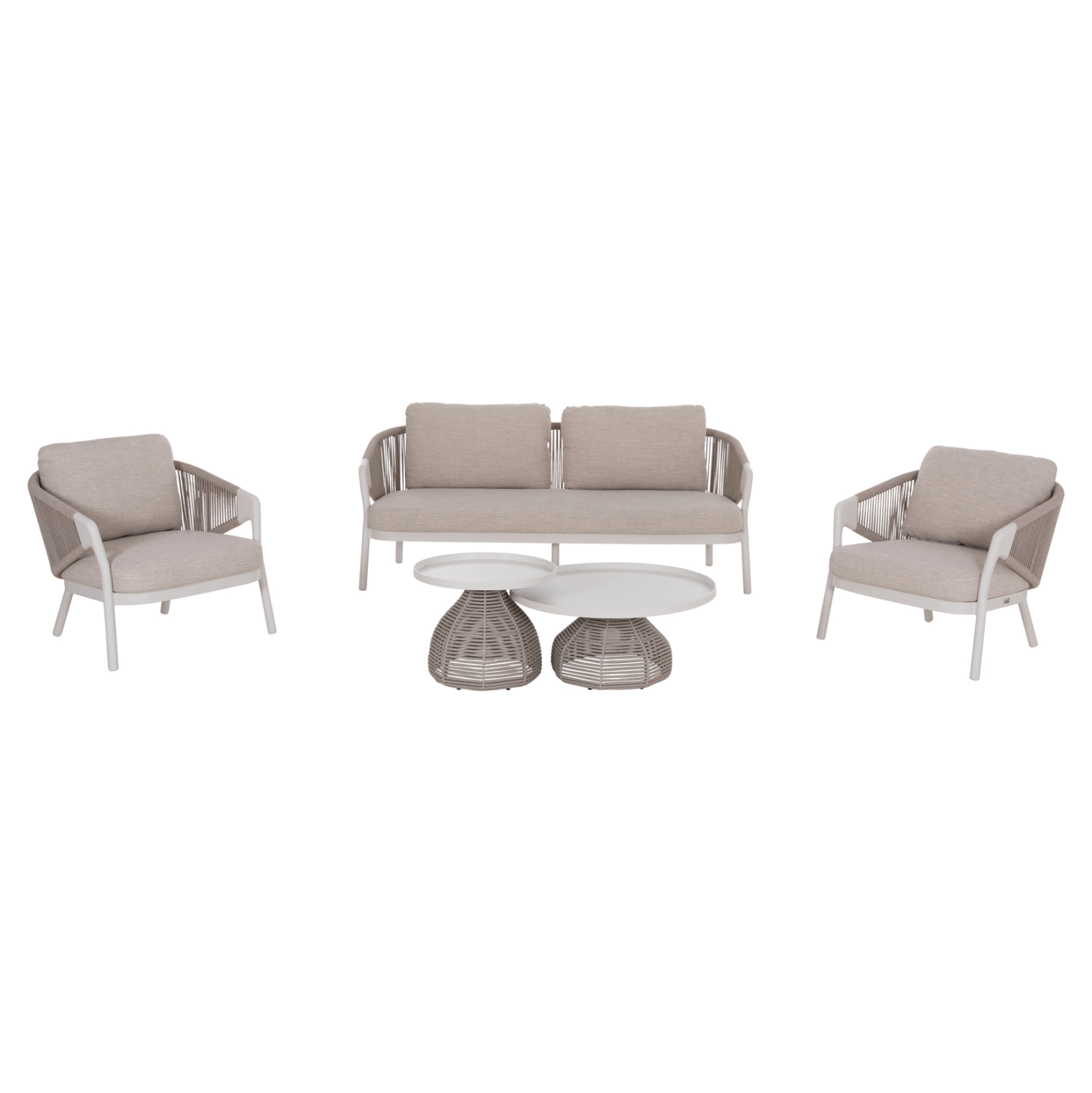 Όλα τα στοιχεία του σετ ακολουθούν την ίδια minimal και κομψή σχεδιαστική γραμμή, με αλουμινένιο σκελετό σε απόχρωση IVORY λευκού και μπεζ συνθετικό σχοινί πάχους 6mm αλλά και ύφασμα OLEFIN, για μοντέρνα και φυσική αισθητική.