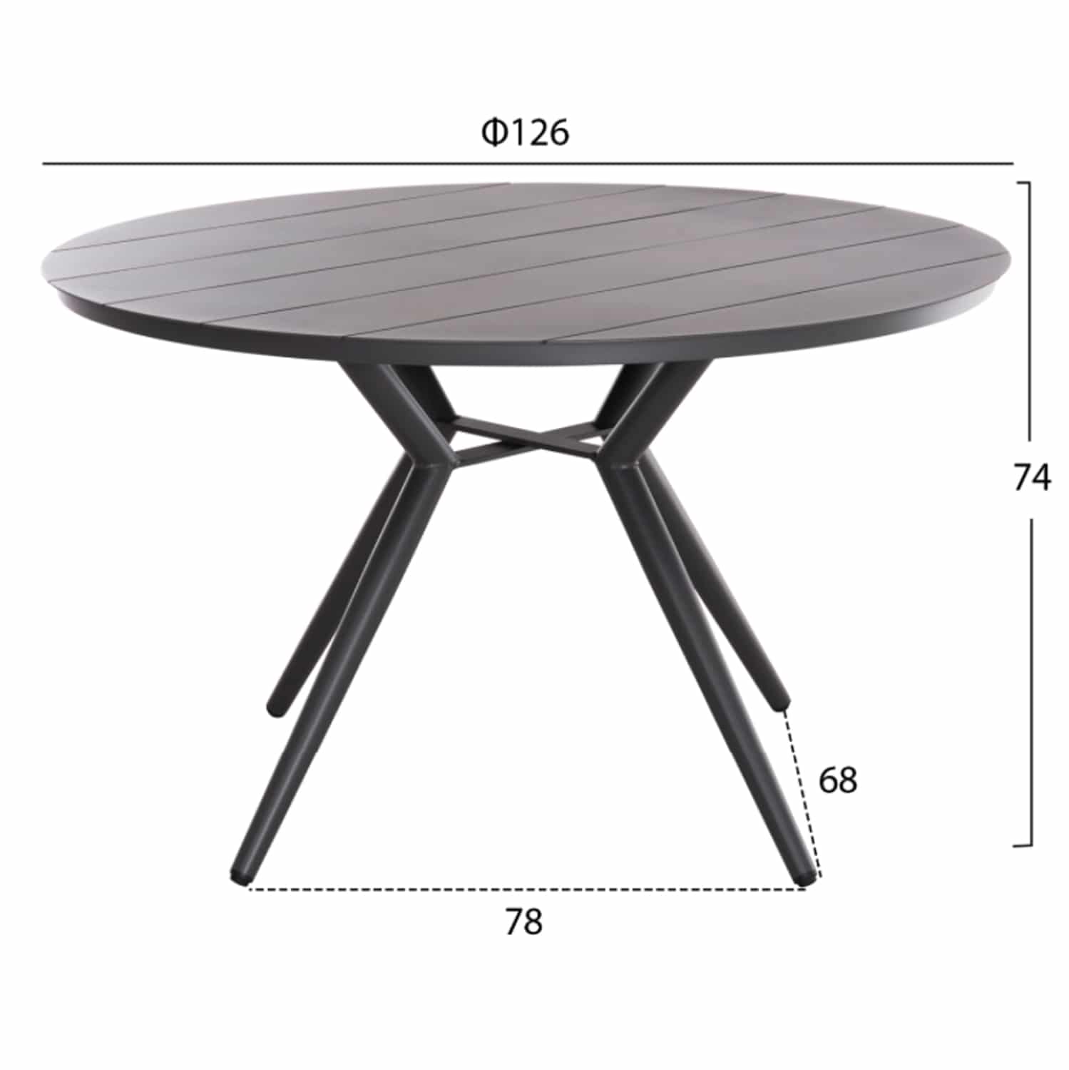 Αυτό είναι ένα σετ τραπεζαρίας εξωτερικού χώρου με ΣΚΟΥΡΟ ΓΚΡΙ αλουμινένιο στρογγυλό τραπέζι και 4 πολυθρόνες αλουμινίου σε ΣΚΟΥΡΟ ΓΚΡΙ χρώμα με κάθισμα textilene και πλάτη από πολυεστερικό RATTAN. Οι πολυθρόνες είναι στοιβαζόμενες.