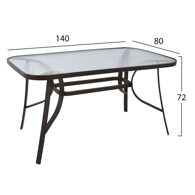 Ένα τραπέζι μεταλλικό εξωτερικού χώρου σε χρώμα καφέ, με ενσωματωμένο γυαλί ασφαλείας (tempered).