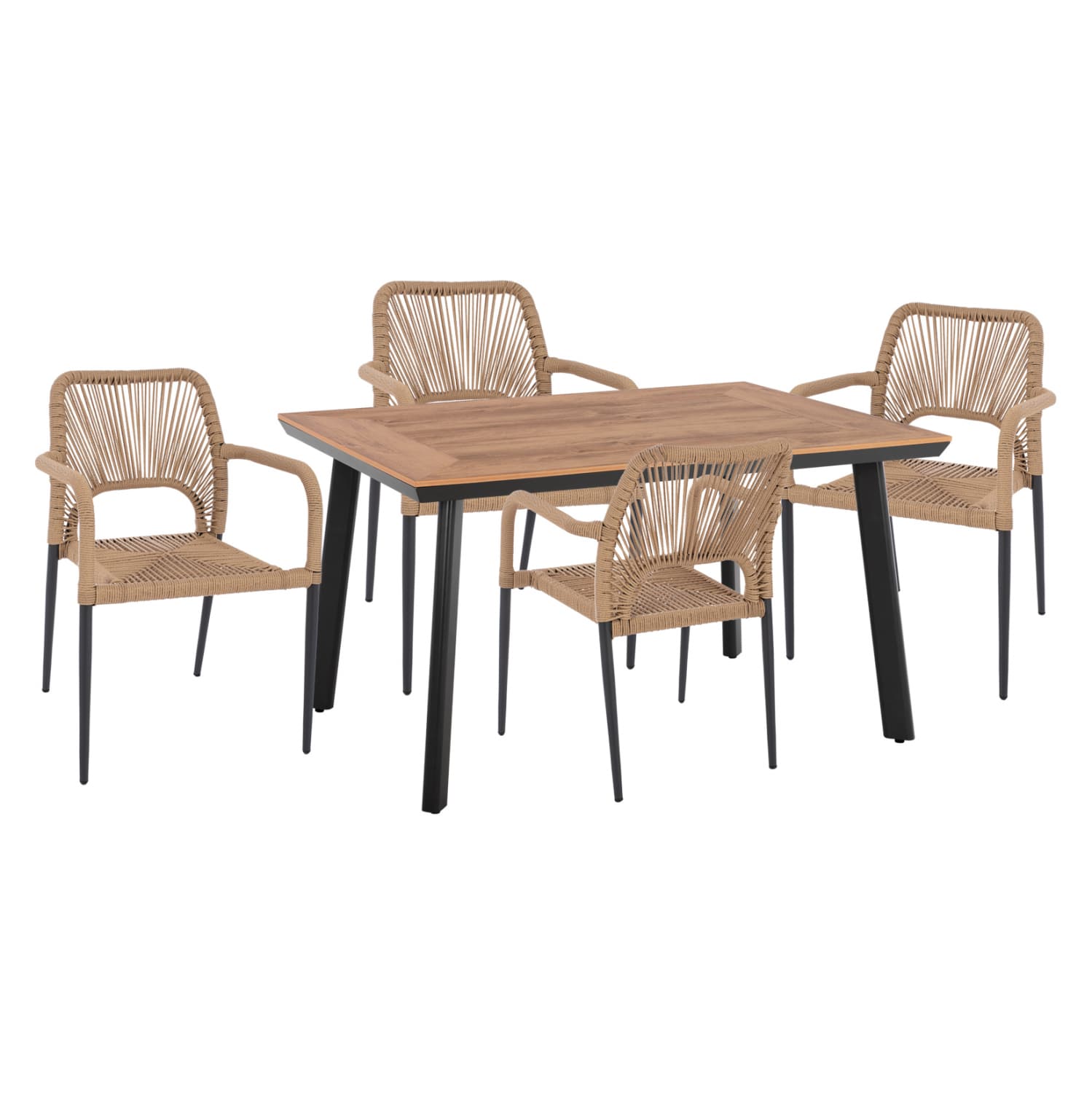 Τέσσερις μοντέρνες πολυθρόνες κατασεκυασμένες από σκελετό αλουμινίου σε γκρι απόχρωση, επενδυμένες με πλεκτό ενισχυμένο PE σχοινί στο κάθισμα και στην πλάτη σε μπεζ απόχρωση.