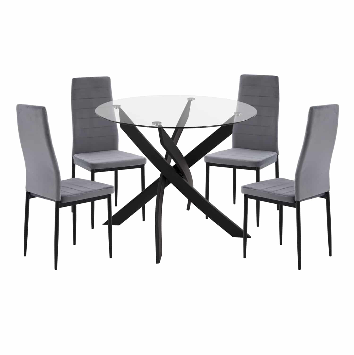 Ένα στρογγυλό τραπέζι με εκπληκτικό design με μεταλλικά πόδια σε ΜΑΥΡΟ χρώμα και γυάλινη επιφάνεια, και 4 καρέκλες με ΜΑΥΡΑ μεταλλικά πόδια και επένδυση από βελούδο σε ΓΚΡΙ χρώμα.