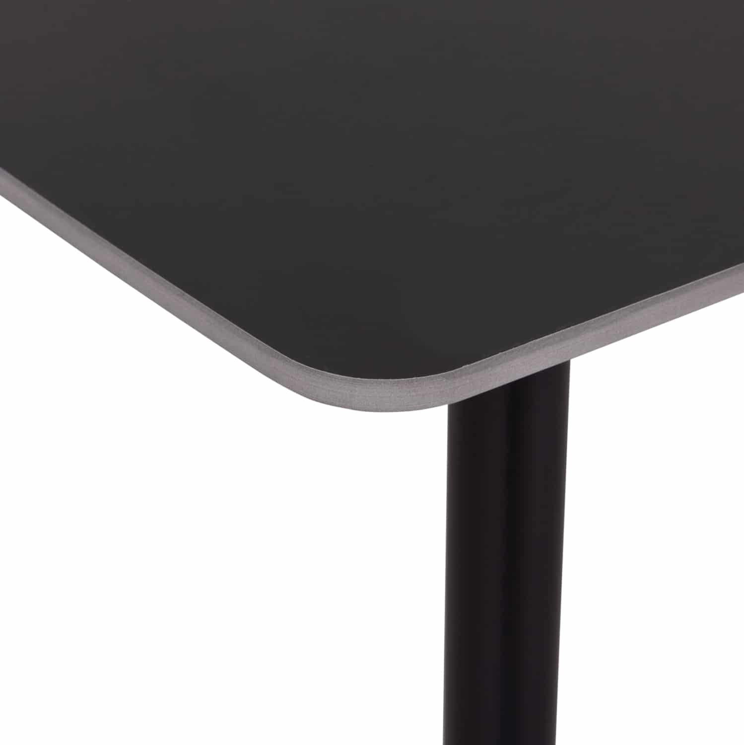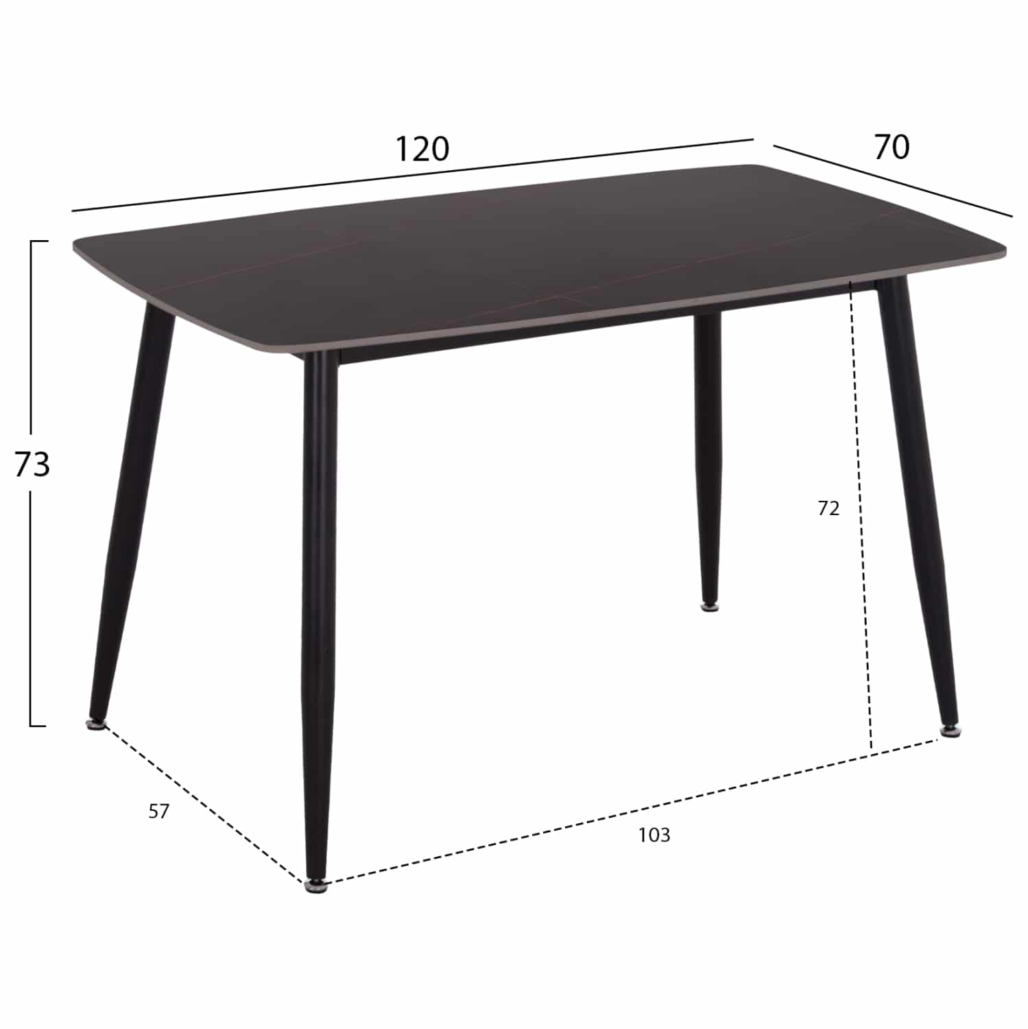 Ένα ορθογώνιο τραπέζι με σκελετό μεταλλικό σε ΜΑΥΡΟ χρώμα και κεραμική επιφάνεια με όψη ΜΑΥΡΟΥ ΜΑΡΜΑΡΟΥ, και 4 καρέκλες με πλάτη και κάθισμα με επένδυση από ύφασμα σε ΑΝΟΙΧΤΟ ΓΚΡΙ χρώμα και μεταλλικό σκελετό σε ΜΑΥΡΟ χρώμα.