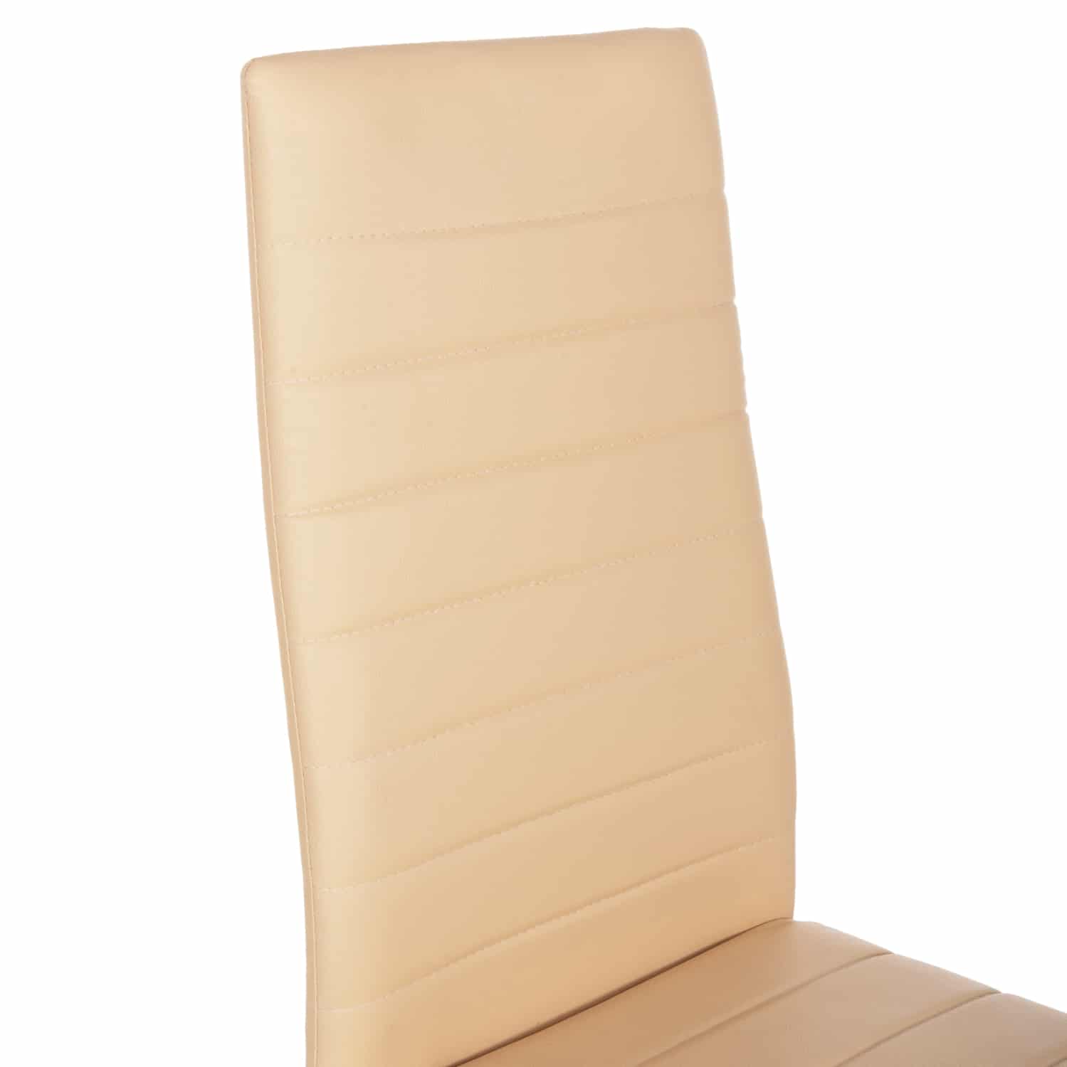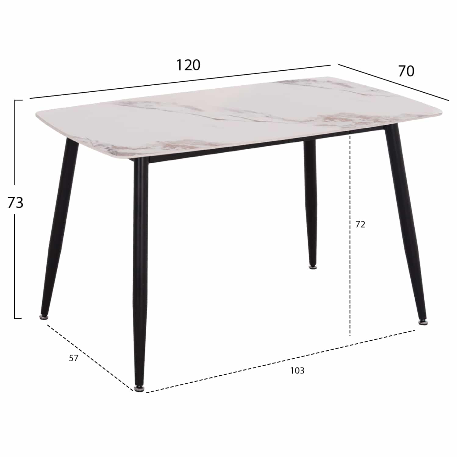 Ένα ορθογώνιο τραπέζι με σκελετό μεταλλικό σε ΜΑΥΡΟ χρώμα και κεραμική επιφάνεια σε χρωματισμό μαρμάρου CALACATTA (όψη λευκού μαρμάρου με καφέ “νερά”), και 4 καρέκλες με ψηλή πλάτη και κάθισμα με επένδυση από συνθετικό δέρμα PU σε ΚΡΕΜ χρώμα και μεταλλικό σκελετό σε ΜΑΥΡΟ χρώμα.