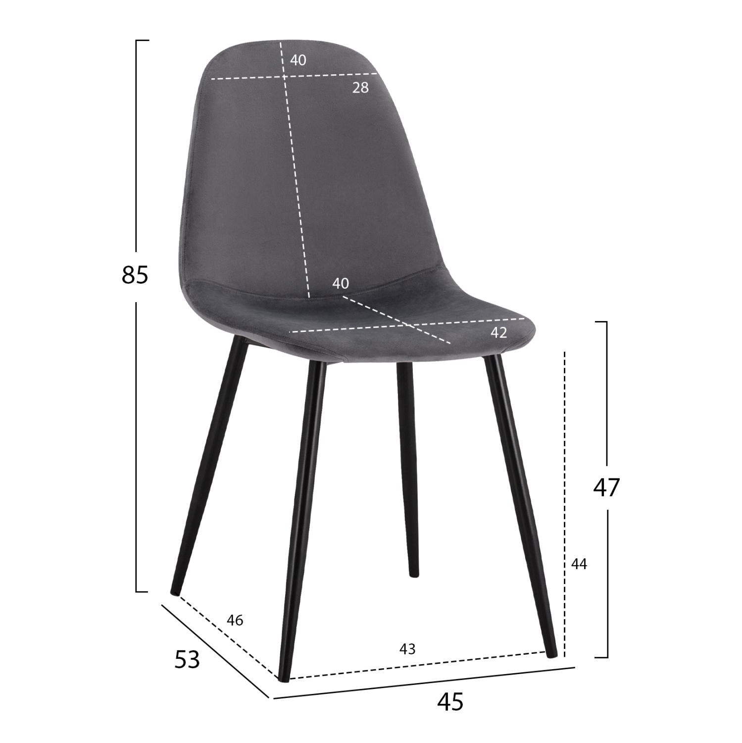 ΗΜ11095.01—Σετ εσωτερικού χώρου με στρογγυλό τραπέζι με επιφάνεια από διάφανο γυαλί ασφαλείας και μεταλλικά πόδια με μοντέρνα γεωμετρία σε μαύρο ματ χρώμα. Οι 4 καρέκλες είναι επενδυμένες με ΓΚΡΙ βελούδινο ύφασμα και έχουν ΜΑΥΡΑ μεταλλικά πόδια. Ένα όμορφο σύνολο με μοντέρνα αισθητική που θα μετατρέψει την τραπεζαρία σας σε έναν ζηλευτό χώρο.