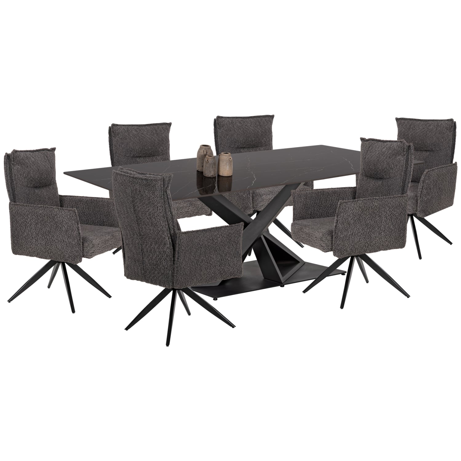 Αυτό το σετ τραπεζαρίας εσωτερικού χώρου αποτελείται από ένα τραπέζι και 6 πολυθρονάκια. Το τραπέζι έχει κανονικές διαστάσεις με γυαλιστερή κεραμική επιφάνεια σε χρωματισμό ΜΑΥΡΟΥ ΜΑΡΜΑΡΟΥ, ενώ τα πόδια/βάση είναι μεταλλικά σε ΜΑΥΡΟ χρώμα. Τα πολυθρονάκια είναι σε χρώμα ΓΚΡΙ και το κάθισμά τους διαθέτει ελατήρια, ενώ στηρίζονται σε μια μεταλλική βάση με 4 πόδια. Το σετ αυτό θα δώσει μια πολυτελή εικόνα σε κάθε χώρο τραπεζαρίας, είτε στο σπίτι, είτε σε επαγγελματικό χώρο.