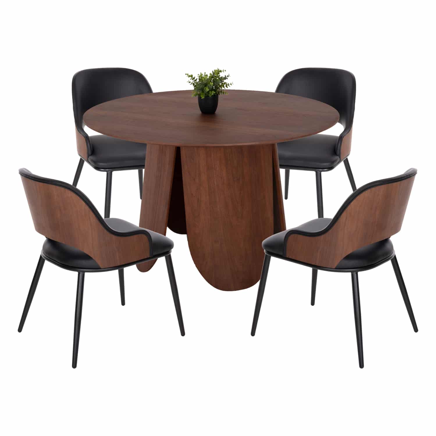 Αυτό το σετ τραπεζαρίας εσωτερικού χώρου αποτελείται από ένα τραπέζι DENTY και 4 καρέκλες DELF. Το DENTY είναι ένα στρογγυλό τραπέζι για την τραπεζαρία, με φαλτσοκομμένη επιφάνεια από MDF με καπλαμά δρυός σε ΚΑΡΥΔΙ χρώμα. Η επιφάνεια αυτή στηρίζεται σε μία πανέμορφη ξύλινη κυλινδρική βάση με ίδιο χρωματισμό. Οι καρέκλες DELF έχουν επένδυση με ΜΑΥΡΟ PU και ΜΑΥΡΑ μεταλλικά πόδια. Αυτό, όμως, που ξεχωρίζει είναι ότι ολόκληρη η πλάτη είναι ξύλινη σε ΚΑΡΥΔΙ χρώμα κι είναι κυρτή και αναπαυτική.