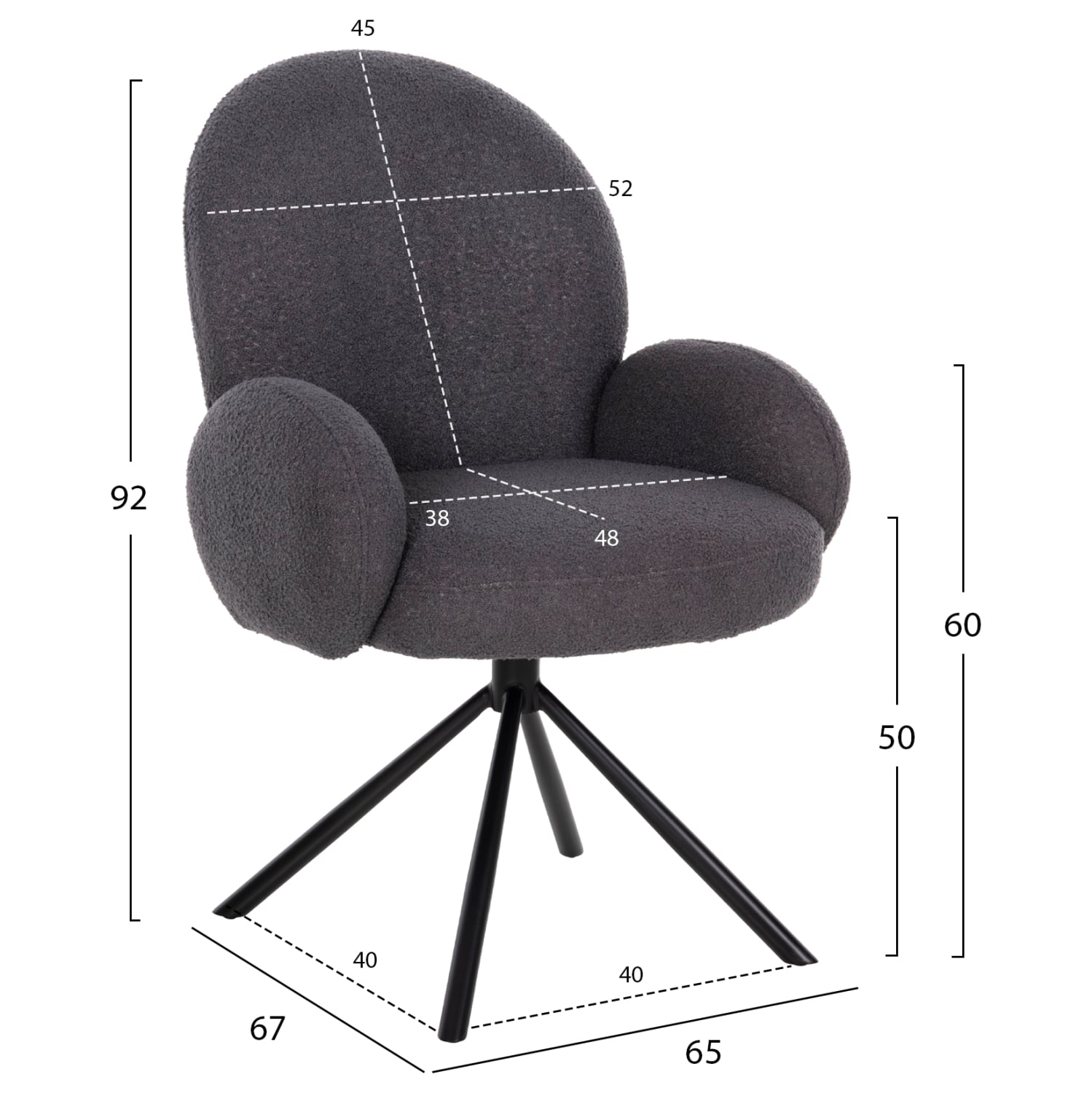 Αυτό το σετ τραπεζαρίας εσωτερικού χώρου αποτελείται από ένα τραπέζι DORIK και 4 πολυθρόνες WINON. Το DORIK είναι ένα στρογγυλό τραπέζι για την τραπεζαρία, με επιφάνεια από MDF σε χρώμα ΛΕΥΚΟΥ ΜΑΡΜΑΡΟΥ. Τα 3 πόδια σε στυλ κολώνας είναι επίσης ΛΕΥΚΑ. Οι πολυθρόνες WINON σε ΓΚΡΙ χρώμα στηρίζονται σε μια μαύρη μεταλλική σαγρέ τετράνυχη βάση στην οποία είναι τοποθετημένος ο πίρος περιστροφής, καθώς το ιδιαίτερο χαρακτηριστικό τους, είναι ότι η περιστρέφονται κατά 180 μοίρες και όχι πλήρως, και διαθέτουν αυτόματη επαναφορά στην αρχική τους θέση. Η επένδυση τους έχει γίνει με υψηλής ποιότητας TEDDY ύφασμα.