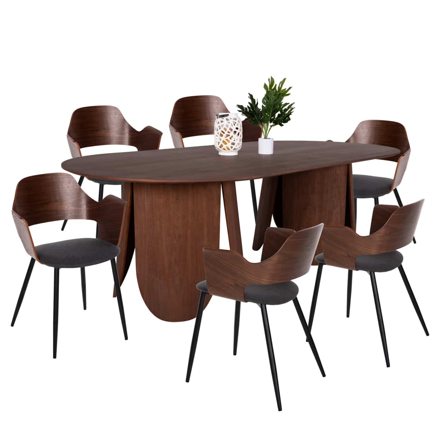 Αυτό το σετ τραπεζαρίας εσωτερικού χώρου αποτελείται από ένα τραπέζι DENTY και 6 καρέκλες VELP. Το DENTY είναι ένα μεγάλο οβάλ τραπέζι για την τραπεζαρία, με φαλτσοκομμένη επιφάνεια από MDF με καπλαμά δρυός σε ΚΑΡΥΔΙ χρώμα. Η επιφάνεια αυτή στηρίζεται σε 2 πανέμορφες ξύλινες κυλινδρικές βάσεις με ίδιο χρωματισμό. Οι καρέκλες VELP έχουν κάθισμα σε ΓΚΡΙ απόχρωση και ΜΑΥΡΑ μεταλλικά πόδια. Αυτό, όμως, που ξεχωρίζει είναι ότι ολόκληρη η πλάτη είναι ξύλινη σε ΚΑΡΥΔΙ χρώμα κι είναι κυρτή και αναπαυτική.