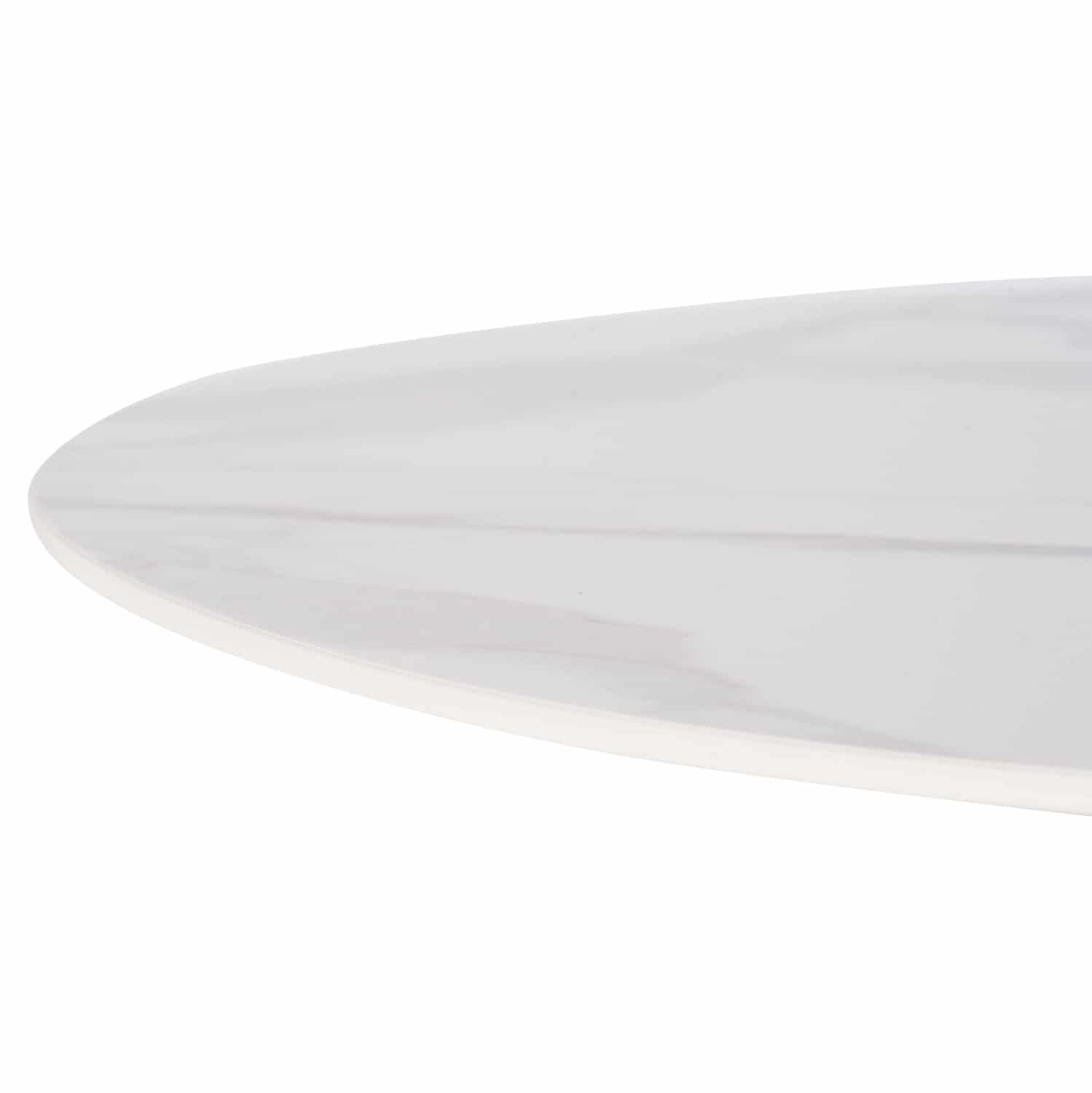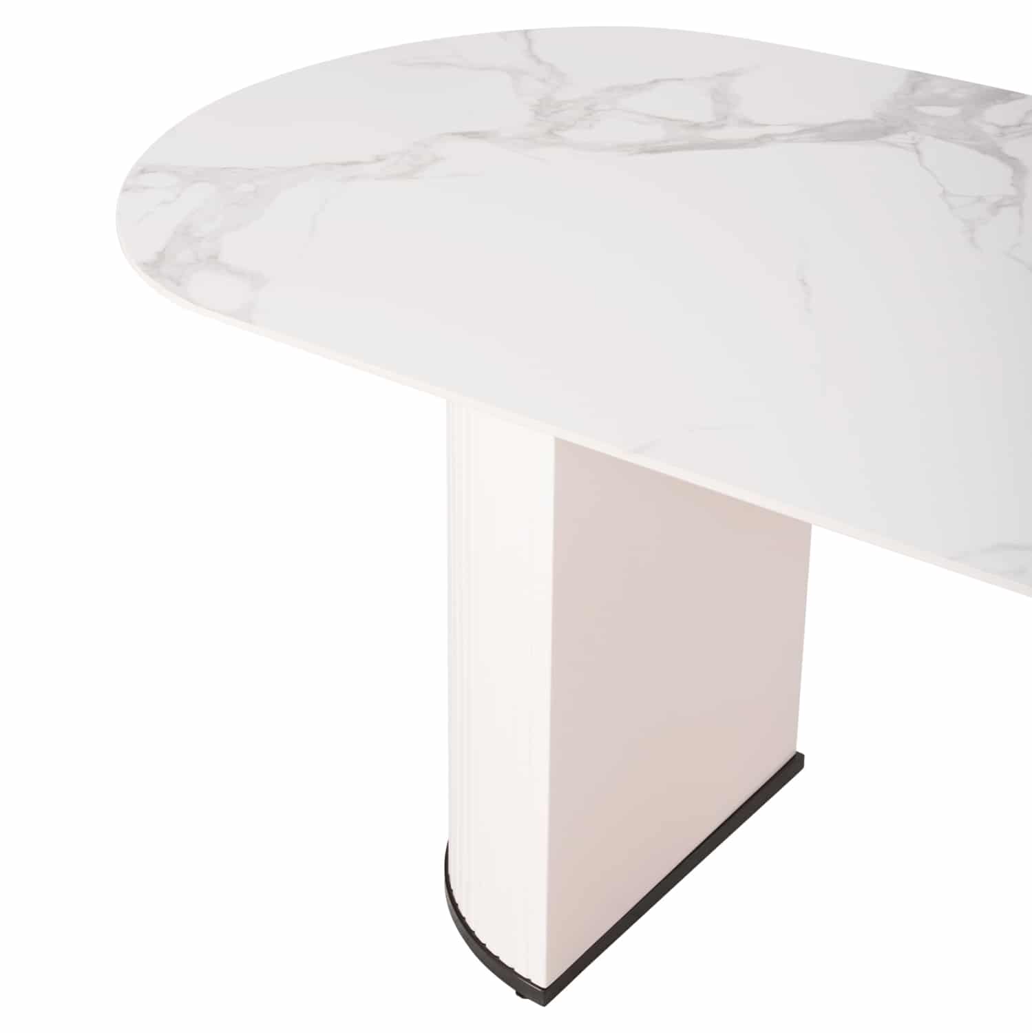 Αυτό το σετ τραπεζαρίας εσωτερικού χώρου αποτελείται από ένα τραπέζι CORBY και 6 πολυθρόνες WINON. Το CORBY είναι ένα μεγάλο τραπέζι τραπεζαρίας με μακρύ οβάλ σχήμα. Η επιφάνεια είναι κεραμική υψηλής ποιότητας σε χρωματισμό ΛΕΥΚΟΥ ΜΑΡΜΑΡΟΥ, ενώ τα πόδια είναι σε ΛΕΥΚΟ χρώμα από MDF. Οι πολυθρόνες WINON σε ΜΠΕΖ χρώμα στηρίζονται σε μια μαύρη μεταλλική σαγρέ τετράνυχη βάση στην οποία είναι τοποθετημένος ο πίρος περιστροφής, καθώς το ιδιαίτερο χαρακτηριστικό τους, είναι ότι η περιστρέφονται κατά 180 μοίρες και όχι πλήρως, και διαθέτουν αυτόματη επαναφορά στην αρχική τους θέση. Η επένδυση τους έχει γίνει με υψηλής ποιότητας TEDDY ύφασμα.