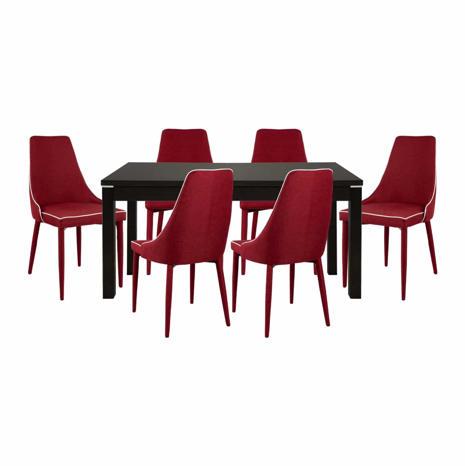 Έξι μοντέρνες καρέκλες επενδυμένες με ύφασμα σε κόκκινο χρώμα και λευκό ρέλι περιμετρικά.