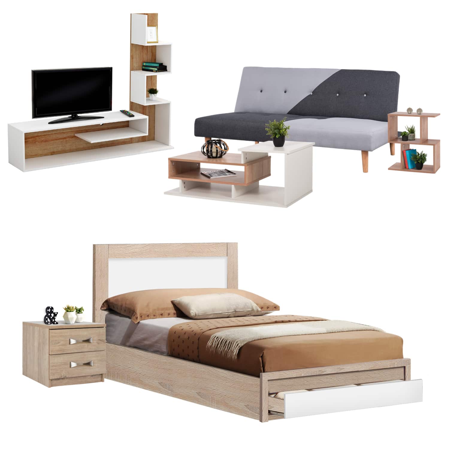 Αυτό το σετ περιλαμβάνει κρεβάτι, κομοδίνο, καναπέ, τραπέζι σαλονιού, βοηθητικό τραπεζακι, και έπιπλο TV