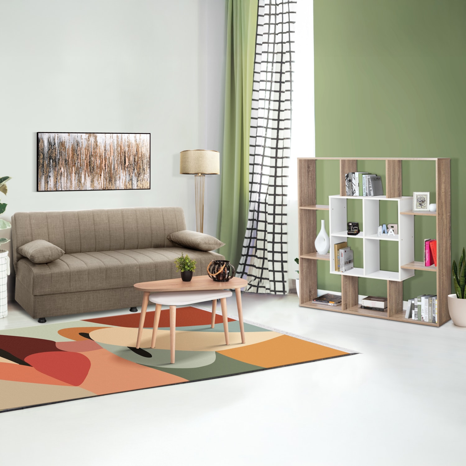 Αυτό το σετ περιλαμβάνει 3-θέσιο καναπέ-κρεβάτι, βιβλιοθήκη, και 2τμχ τραπέζια σαλονιού! Αναλυτικά: