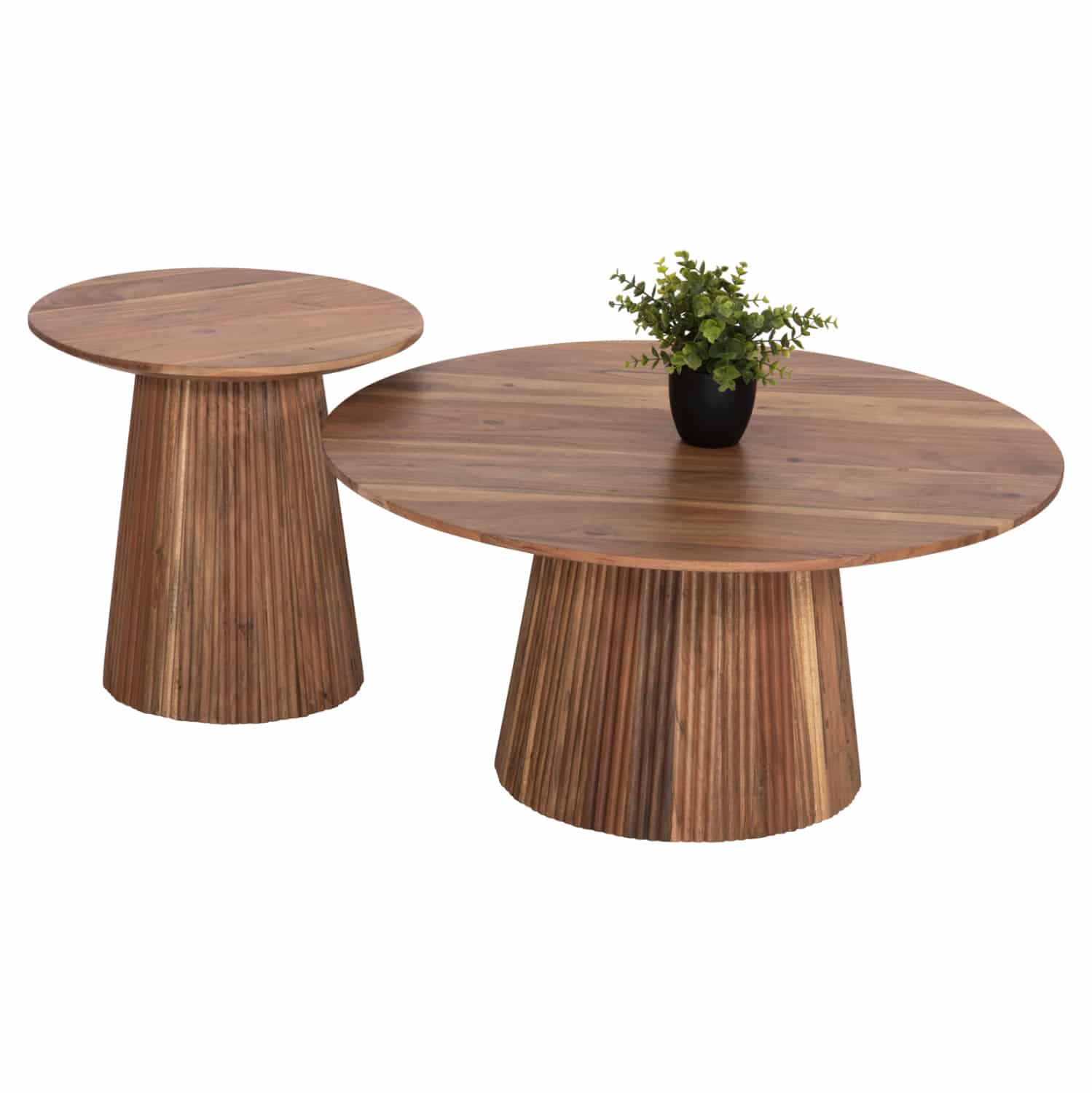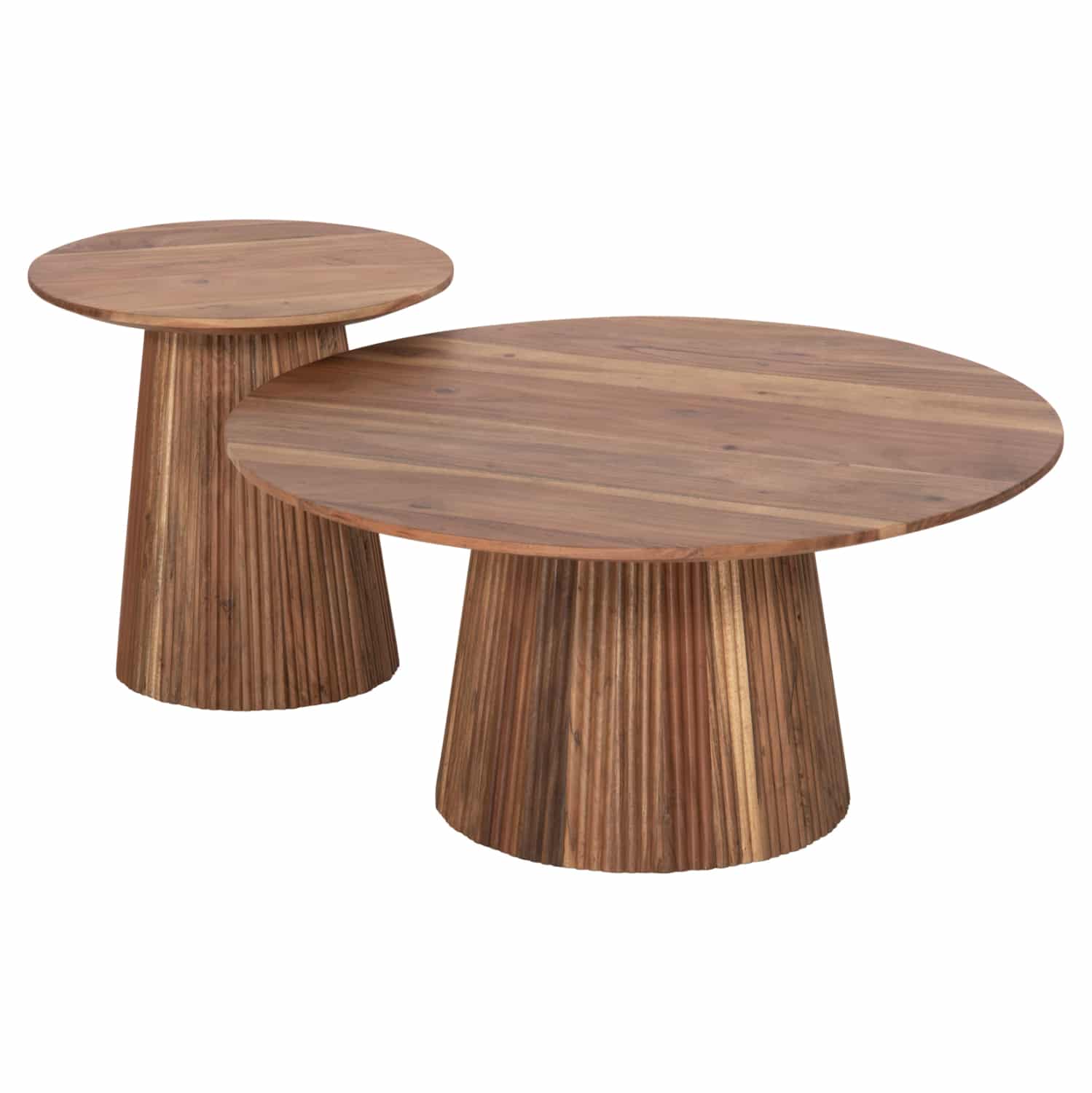 Το σετ 2 τραπεζιών GROOT αποτελείται από 2 στρογγυλά τραπέζια για το σαλόνι σε 2 διαστάσεις σε φυσικό χρώμα ξύλου. Οι επιφάνειες των τραπεζιών στηρίζονται σε μια ξύλινη κολώνα στο κέντρο με κωνικό σχήμα. Αυτό το σετ θα αναβαθμίσει αισθητικά το σαλόνι σας ενώ μπορεί να ταιριάξει με πολλά διαφορετικά στυλ και χρώματα στον τριγύρω χώρο.