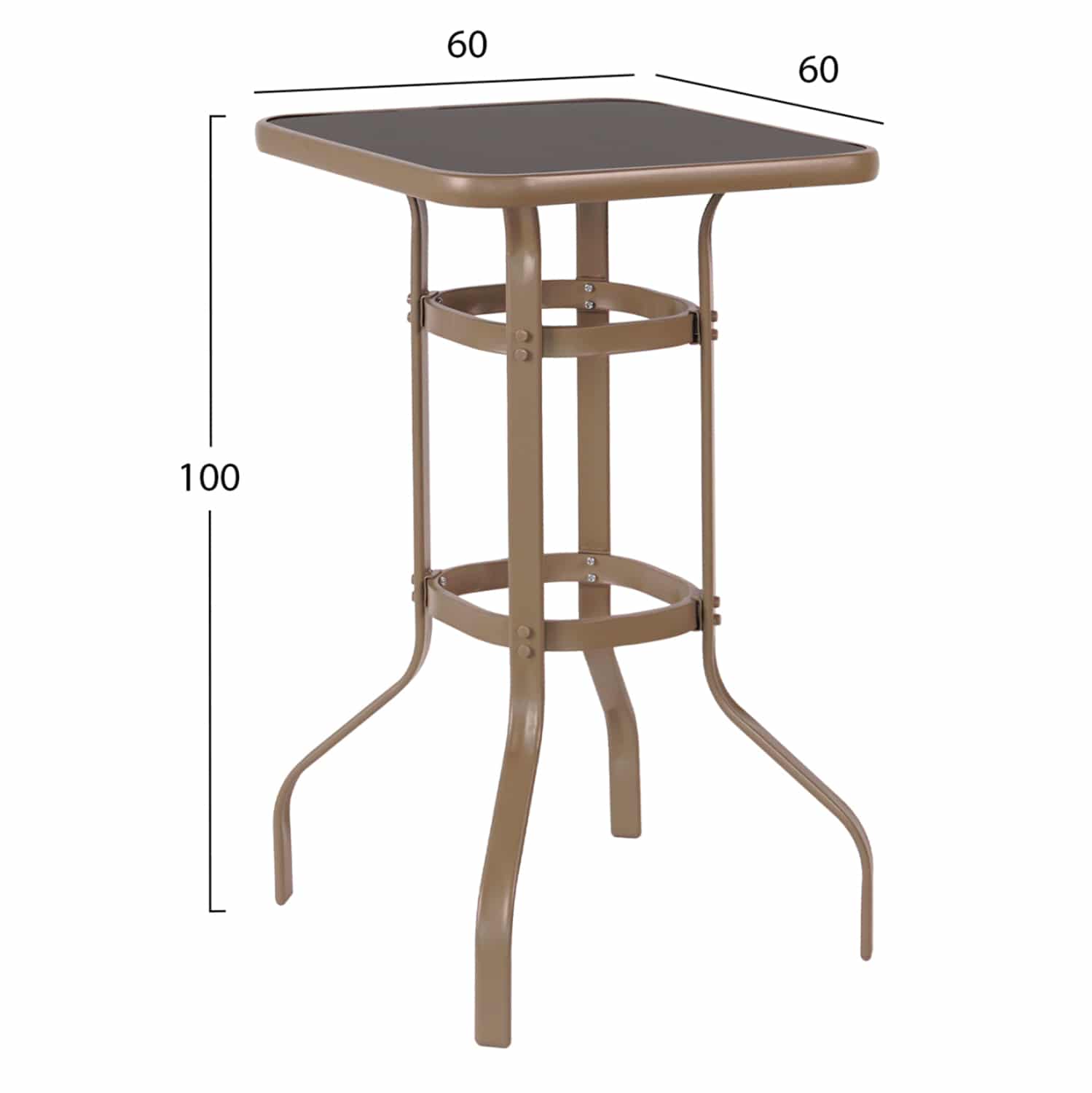 Σετ εξωτερικού χώρου που αποτελείται από 2 σκαμπό μπαρ μεσαίου ύψους και 1 τραπεζάκι μπαρ, όλα σε ΣΑΜΠΑΝΙ χρώμα. Τα σκαμπό διαθέτουν πλάτη και κάθισμα από «φέτες» αλουμινίου, ενώ ο σκελετός τόσο στα σκαμπό όσο και στο τραπέζι είναι μεταλλικός. Το γυαλί στο τραπέζι είναι ασφαλείας.