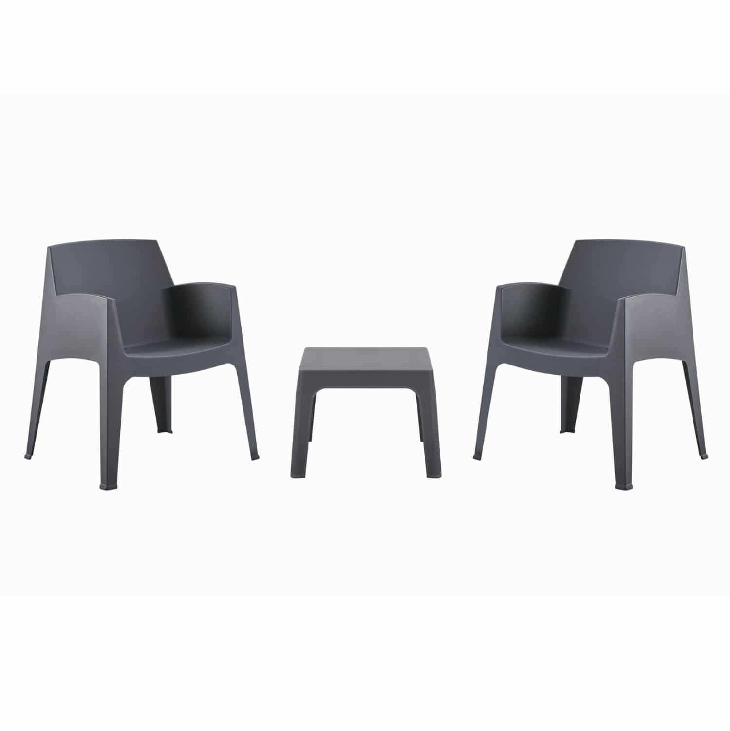 Ένα τετράγωνο τραπεζάκι και 2 στοιβαζόμενες πολυθρόνες, τα οποία είναι εξολοκλήρου κατασκευασμένα από πολυπροπυλένιο σε ΓΚΡΙ χρώμα. Σχεδιαστικά, είναι λιτό και μπορεί να χρησιμοποιηθεί με πολλούς τρόπους προσφέροντας πρακτική και ανθεκτική χρήση. Ιδανική πρόταση για χρήση σε εξωτερικούς χώρους, είτε επαγγελματικούς (χώροι δεξιώσεων, εταιρείες catering, κλπ.) είτε για το σπίτι.