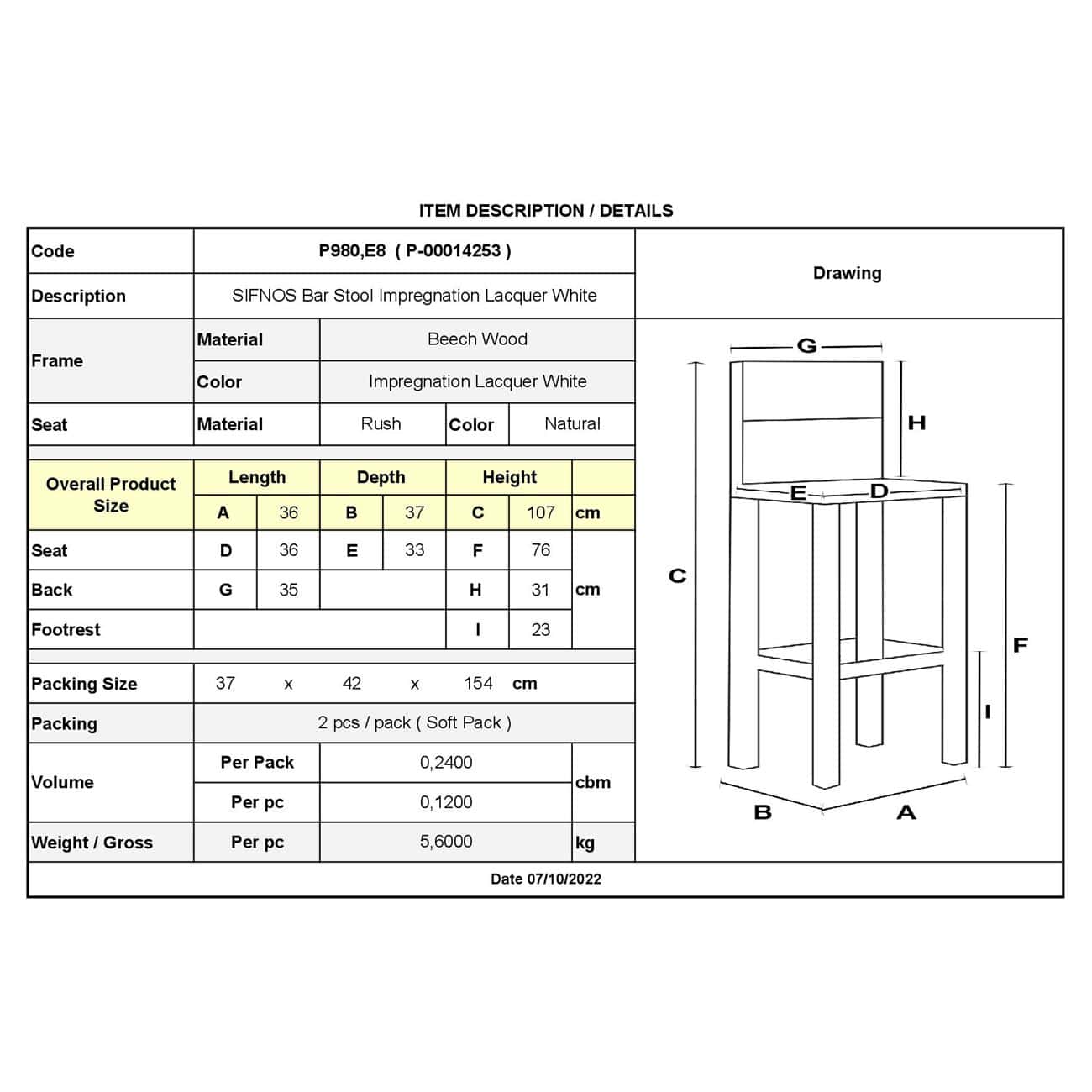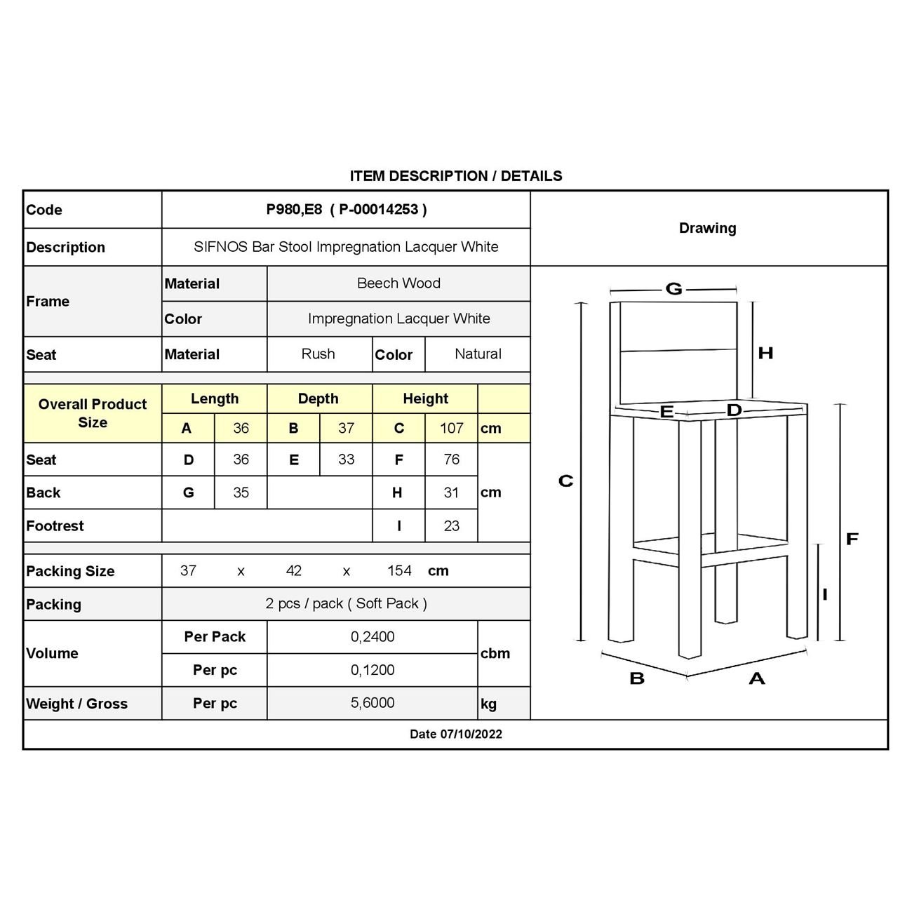 Ρ980,Ε8 ΣΙΦΝΟΣ Σκαμπό BAR 42R Ψάθα Εμποτ.Λάκα Άσπρο