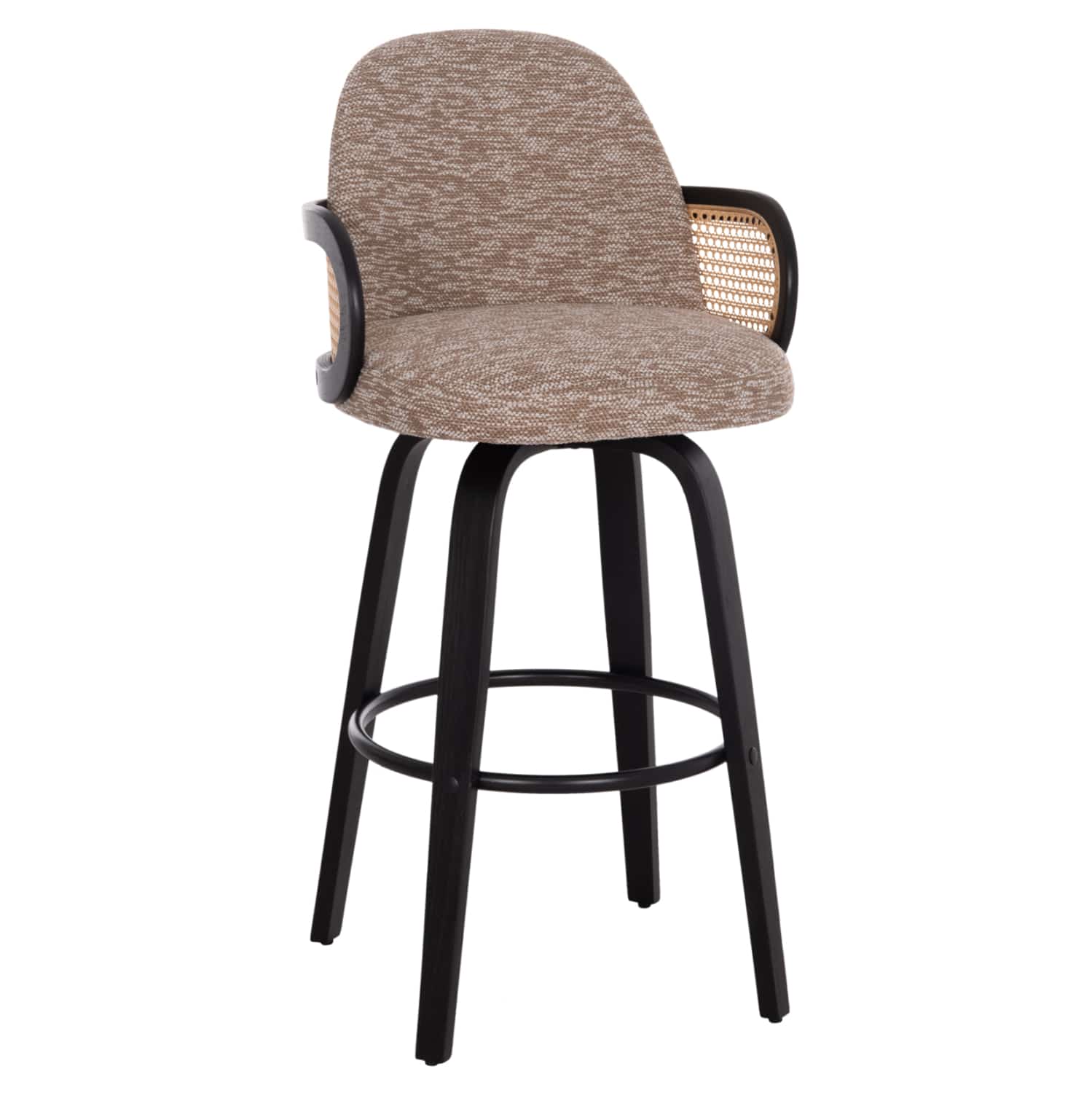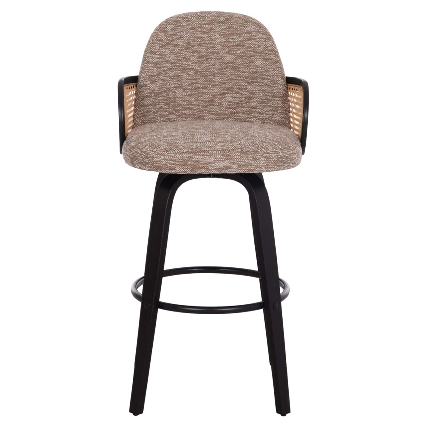Το περιστρεφόμενο σκαμπό μπαρ BECKER αποτελεί ακόμα μια εξαιρετική πρόταση, κυρίως για επαγγελματικούς χώρους. Ο πανέμορφος σκελετός με το συμμετρικό design είναι από plywood σε επιβλητικό ΜΑΥΡΟ χρώμα, και το χαρακτηριστικό του είναι η μπεζ «σίτα» που υπάρχει στην κατασκευή των μπράτσων. Το κάθισμα και η πλάτη είναι επενδυμένα με υπέροχο ανάγλυφο ύφασμα σε ΚΑΦΕ χρώμα, ενώ στο κάτω μέρος των ποδιών υπάρχουν ρεγουλατόροι για ρύθμιση της σταθερότητας του σκαμπό. Διαθέτει και υποπόδιο που ενώνει τα 4 πόδια κυκλικά.