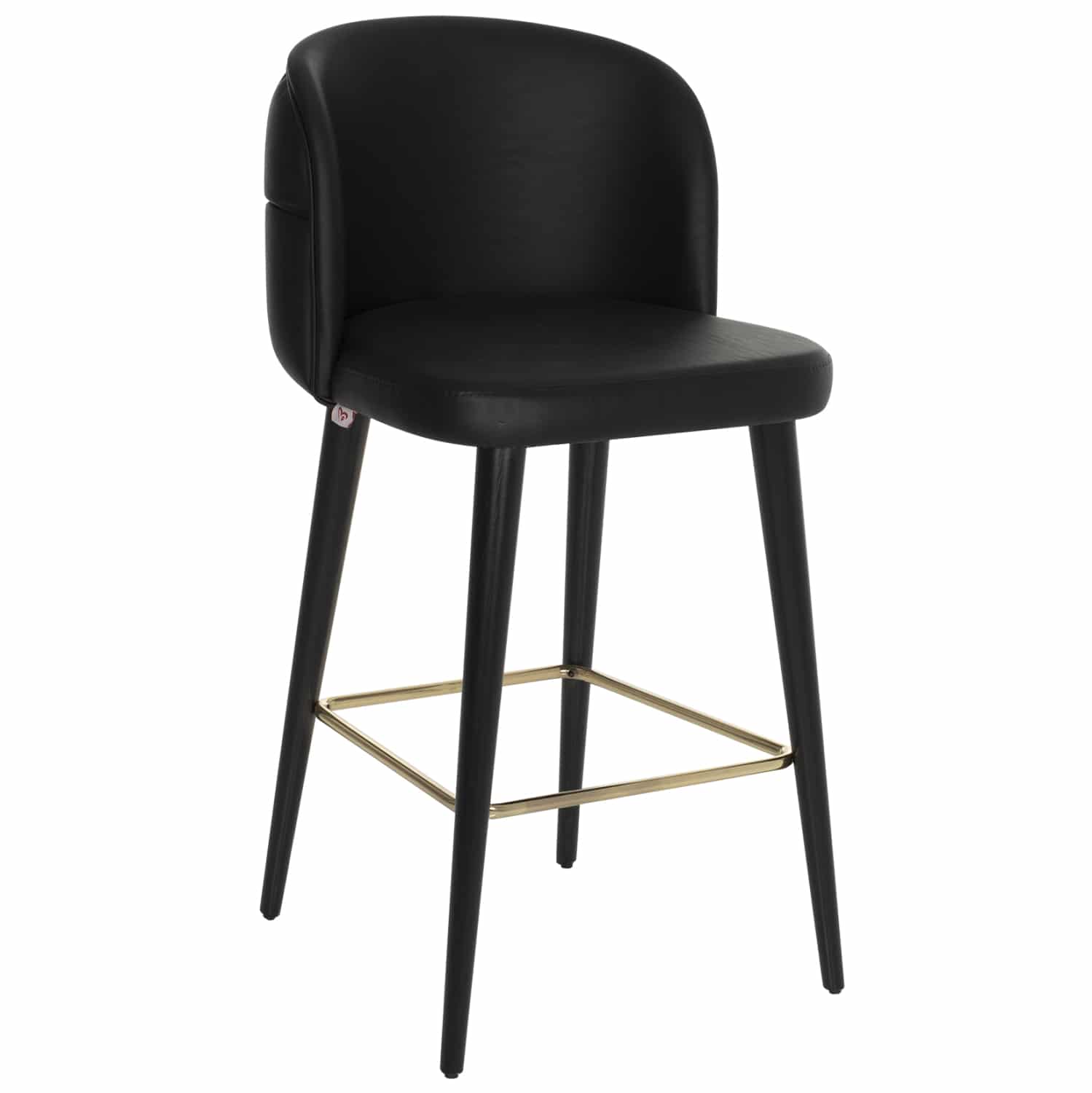 Επαγγελματικό σκαμπό bar «MARCELLO” σε ΜΑΥΡΟ χρώμα με μαύρα ξύλινα πόδια. Τα πόδια ενώνονται μεταξύ τους περίπου στη μέση τους με μια μεταλλική ορθογώνια ράγα σε χρυσή απόχρωση. Το «MARCELLO” είναι λιτό, ποιοτικό και κομψό στην όψη, και σίγουρα τραβάει τα βλέμματα με το όμορφο PU δέρμα με το οποίο είναι επενδυμένο. Είναι ψηλό με πλάτη, η οποία στο πίσω μέρος της έχει καπιτονέ τεχνοτροπία, πράγμα που επιτείνει τον ιδιαίτερο χαρακτήρα αυτού του σκαμπό.