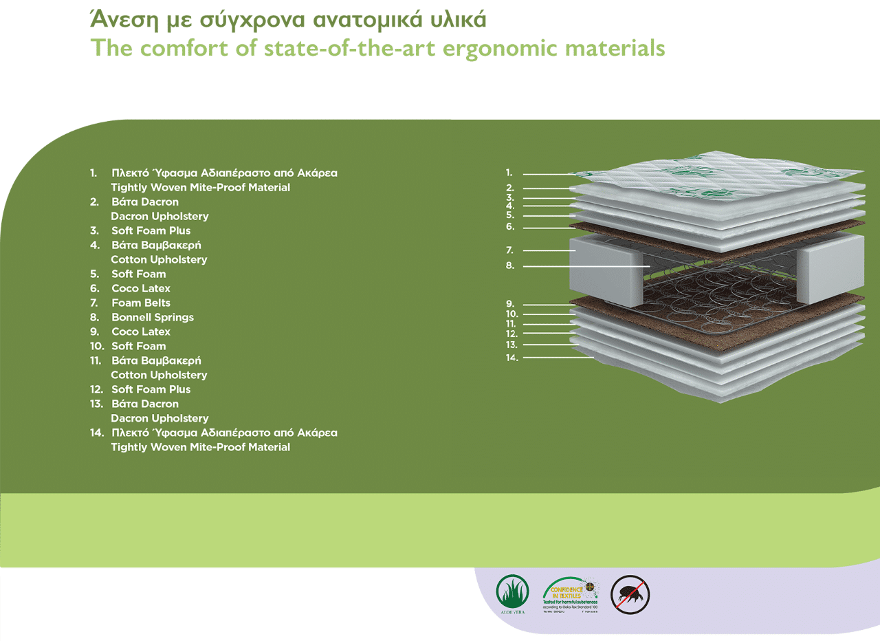 Το φυσικό περιβάλλον και οι οικολογικές επιταγές λαμβάνονται σοβαρά υπόψη στην παραγωγή των οικολογικών στρωμάτων της σειράς Eco Pure. Οικολογικά υφάσματα ειδικής επεξεργασίας σε συνδυασμό με βαμβάκι άριστης ποιότητας ανανεώνουν τον αέρα στο εσωτερικό του στρώματος, προσφέροντας ξεκούραση και ανάλαφρο ύπνο. Η χρήση του φυσικού κοκοφοίνικα με στρώσεις από latex καθιστά το στρώμα εύκαμπτο, απορροφά την υγρασία και εγγυάται συνθήκες υγιεινού ύπνου.