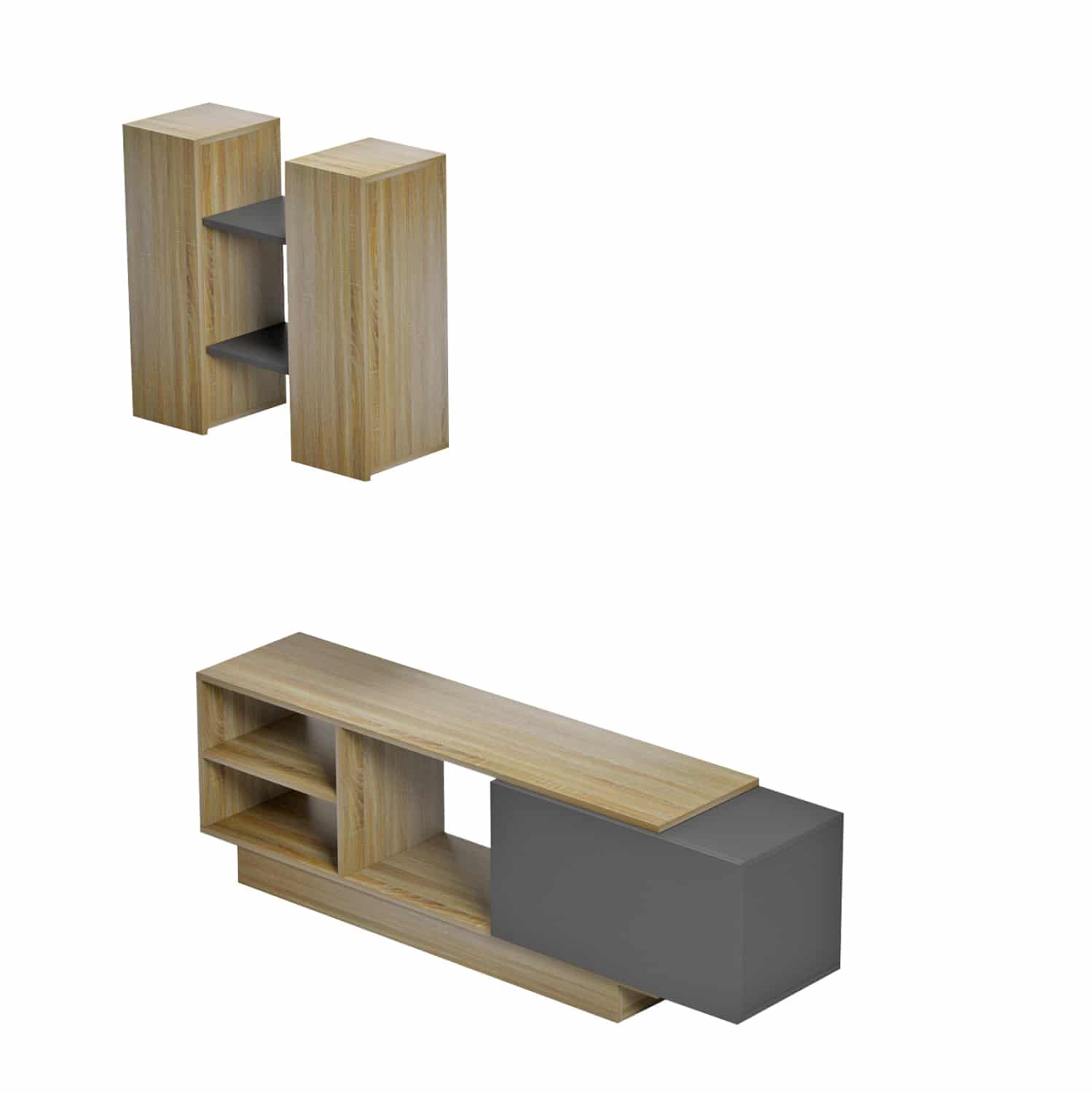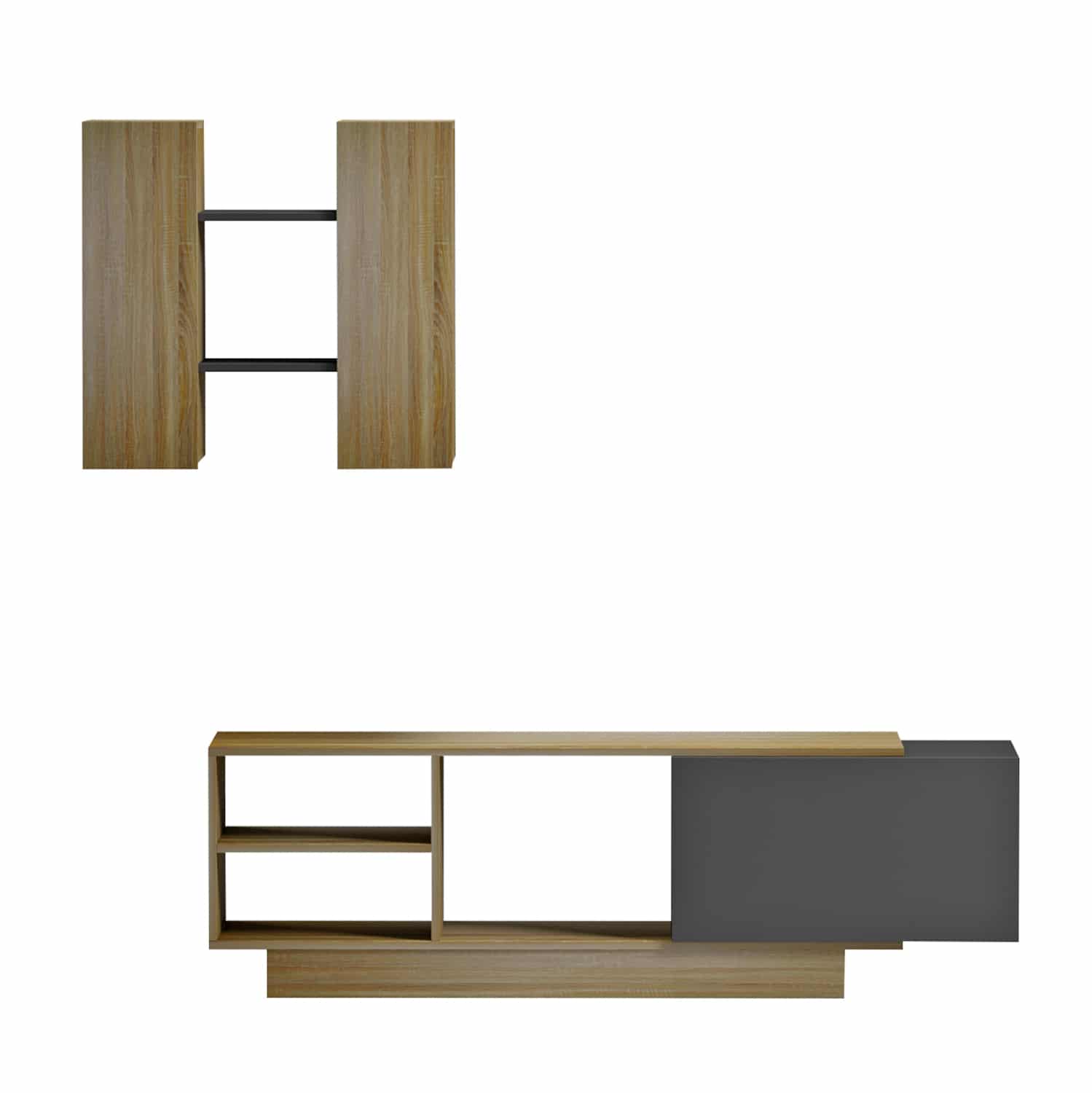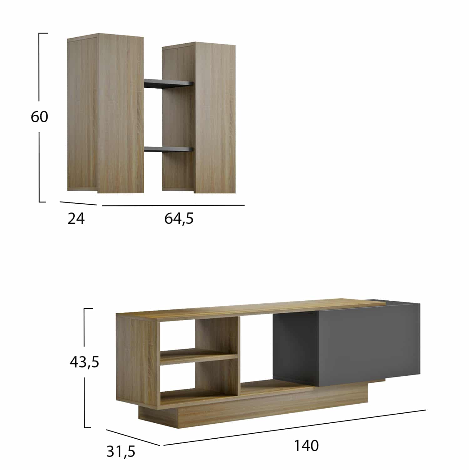 Το TYSON είναι μια μοντέρνα και πρακτική σύνθεση τηλεόρασης σε SONAMA και ΓΚΡΙ χρώμα, που θα ομορφύνει το σαλόνι σας! Το κυρίως έπιπλο είναι μακρύ και διαθέτει 1 ντουλάπι για αποθήκευση αντικειμένων, και 3 ανοιχτούς χώρους για την τοποθέτηση ηλεκτρονικών συσκευών, μικροαντικειμένων, και βιβλίων. Η σύνθεση ολοκληρώνεται με 2 ντουλάπια τοίχου με εσωτερικά ράφια που «ενώνονται» με άλλα δύο επιτοίχια ανοιχτά ράφια. Πρόκειται για μια λιτή, κομψή και ολοκληρωμένη πρόταση για το σαλόνι σας!