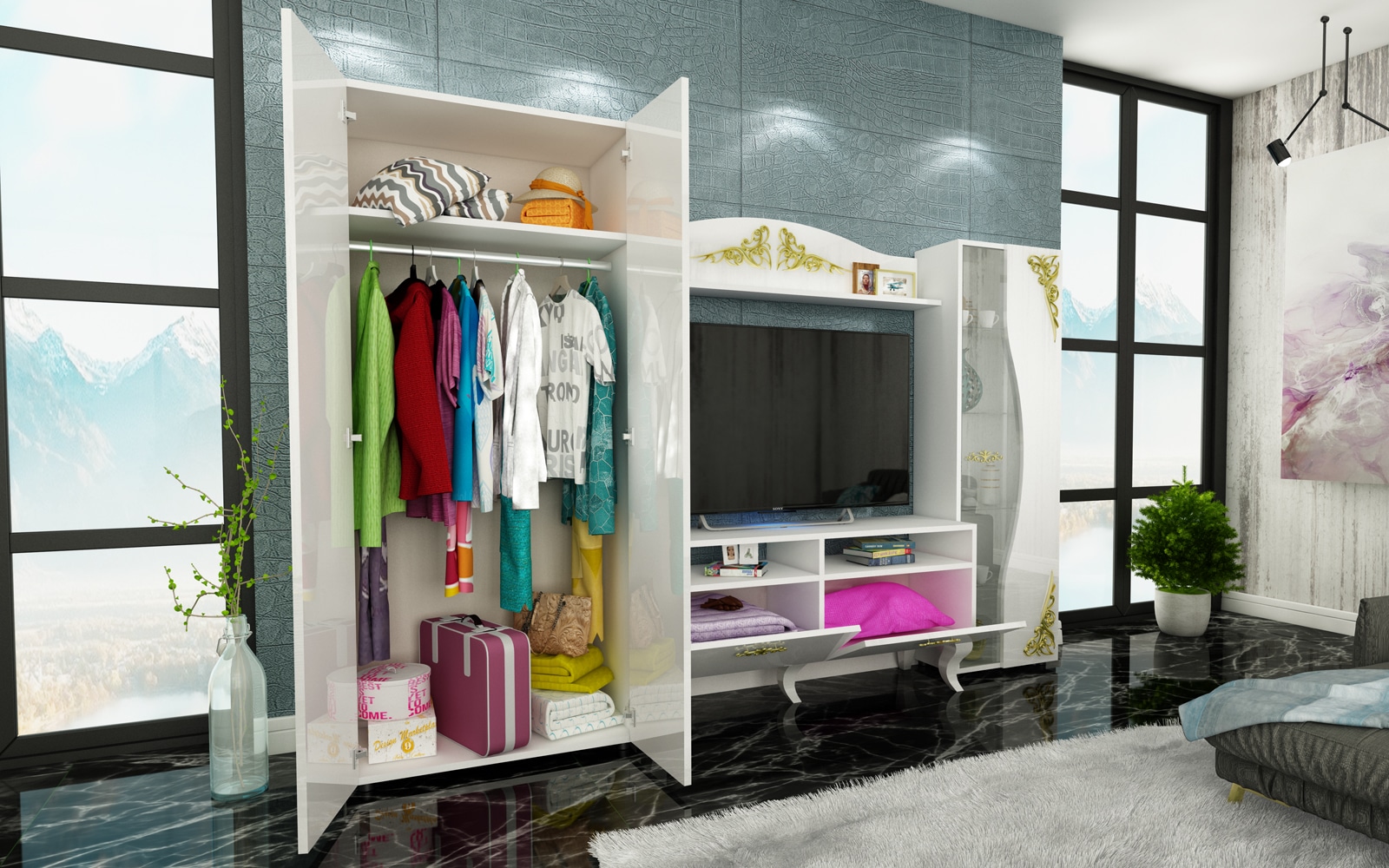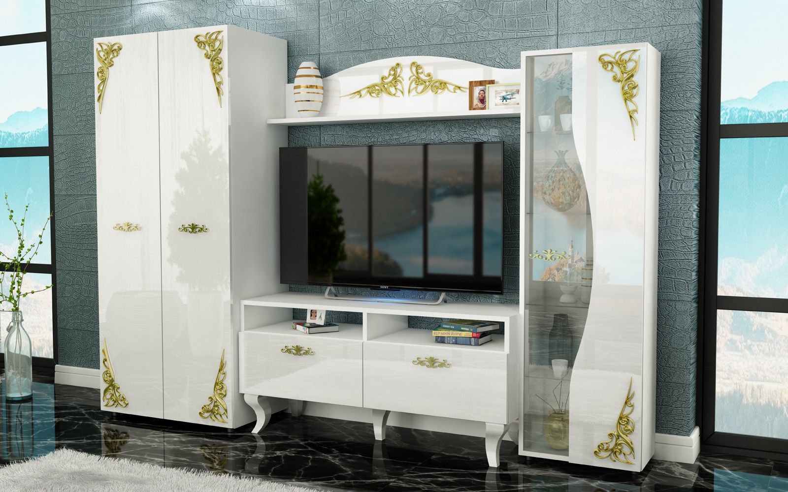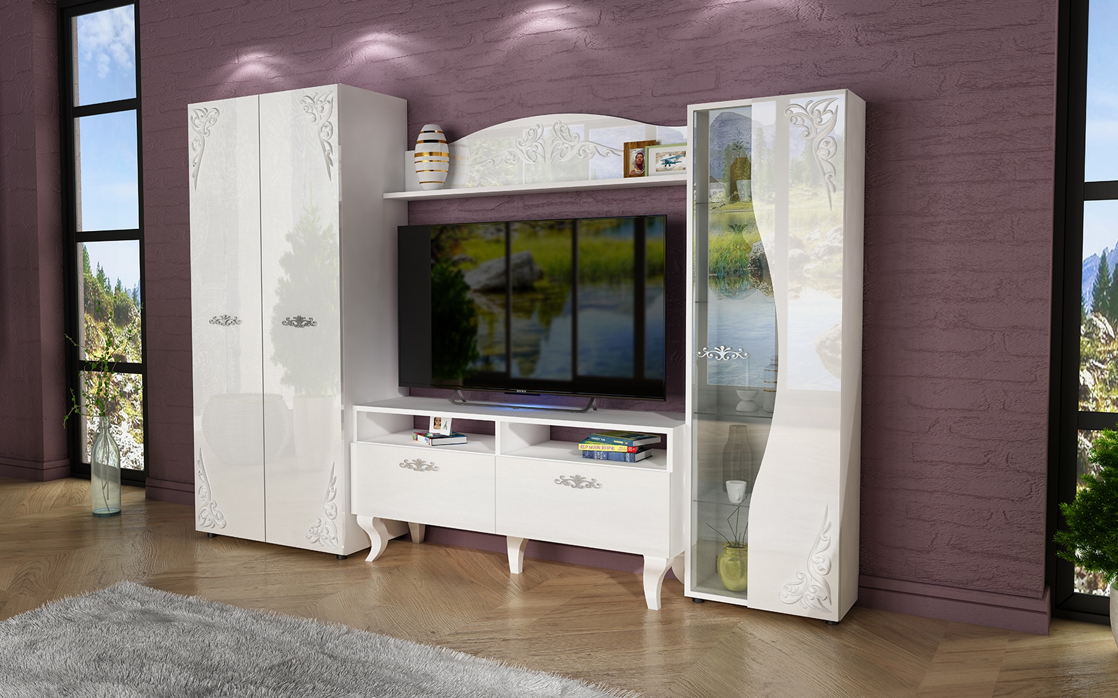 Στην τιμή δεν συμπεριλαμβάνονται η τηλεόραση, το ντεκόρ που απεικονίζεται στη φωτογραφία και οι υπηρεσίες μεταφοράς και συναρμολόγησης.