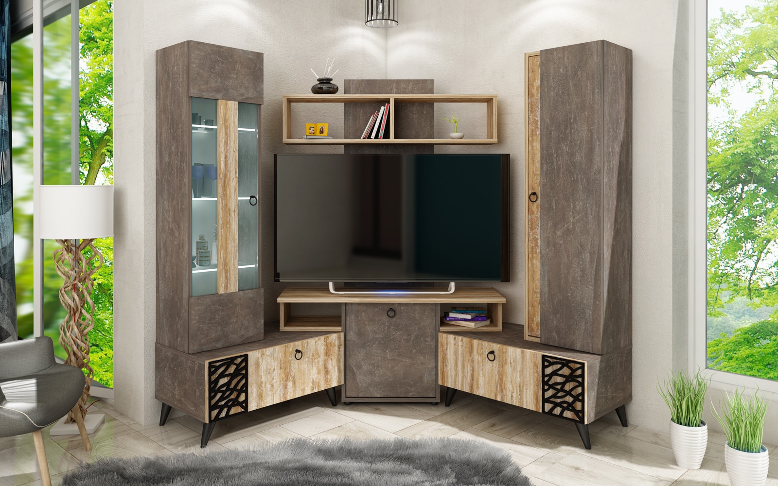 Στην τιμή δεν συμπεριλαμβάνονται η τηλεόραση, το ντεκόρ που απεικονίζεται στη φωτογραφία και οι υπηρεσίες μεταφοράς και συναρμολόγησης.