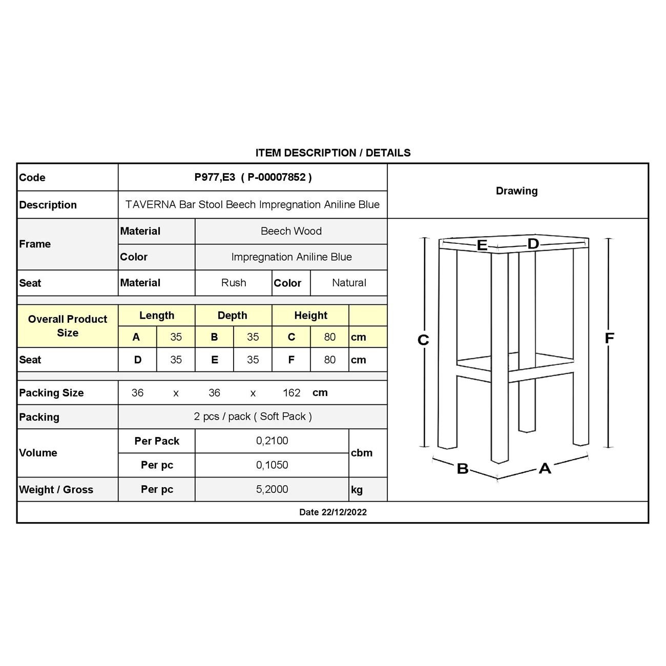 Ρ977,Ε3 ΤΑΒΕΡΝΑΣ Σκαμπό BAR 42RC Ψάθα Εμποτ.Ανιλίνη Μπλε