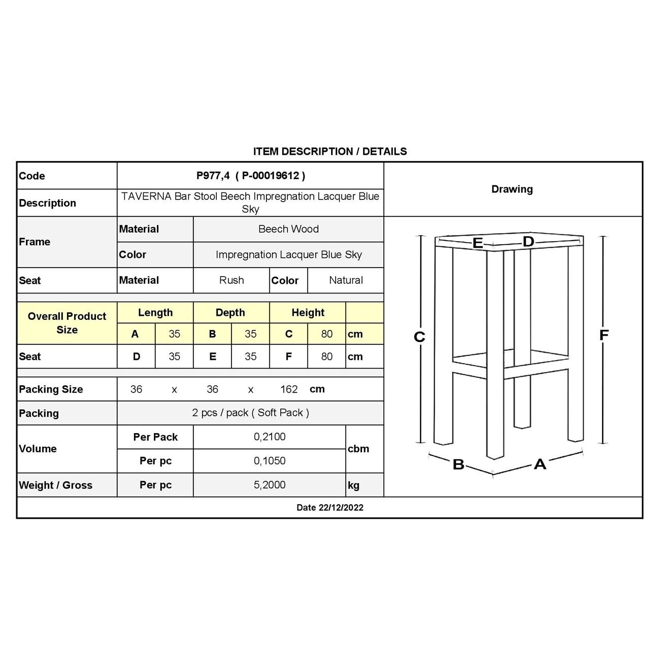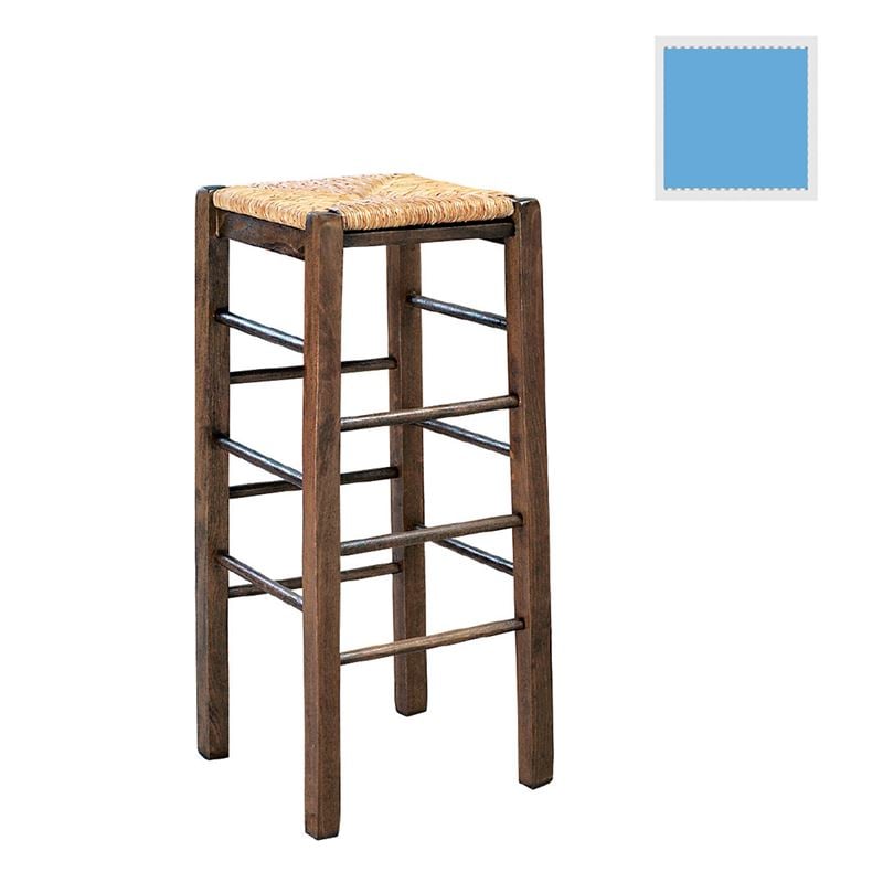 ΤΑΒΕΡΝΑΣ Σκαμπό BAR, Οξιά Εμποτισμός Λάκα Γαλάζιο, Κάθισμα Ψάθα 35x35x80cm