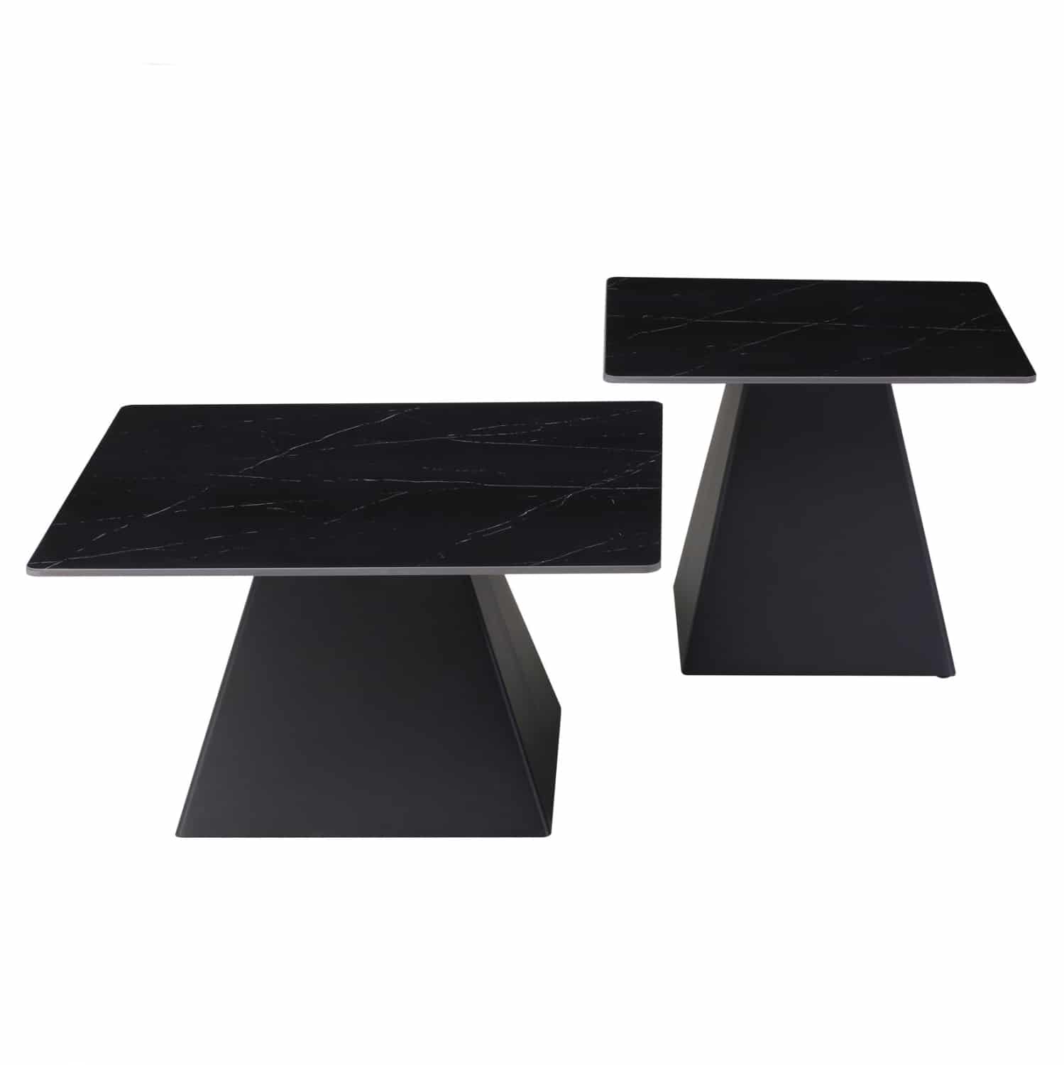 Το σετ 2 τραπεζιών QUBER για το σαλόνι θα αποτελέσει μια υπέροχη προσθήκη στον χώρο σας. Πρόκειται για 2 τετράγωνα μεταλλικά τραπεζάκια διαφορετικών μεγεθών με ΜΑΥΡΕΣ βάσεις σε σχήμα πυραμίδας. Οι επιφάνειες είναι λείες κεραμικές με όψη ΜΑΥΡΟΥ μαρμάρου. Ιδανικά τόσο για το σπίτι, όσο και για επαγγελματικούς χώρους.