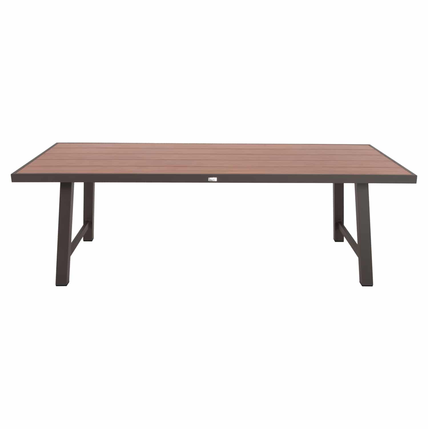 Το GOBAR είναι ένα μεγάλο ορθογώνιο τραπέζι για εξωτερικούς χώρους με σκελετό αλουμινίου σε ΣΑΜΠΑΝΙ χρώμα. Η επιφάνεια είναι επίσης από slats (φέτες) αλουμινίου σε χρώμα απομίμησης ξύλου. Πρόκειται για ένα τραπέζι που μπορεί να εξυπηρετήσει 8 τουλάχιστον άτομα, φιλοξενώντας τις πιο όμορφες στιγμές της ζωής σας.