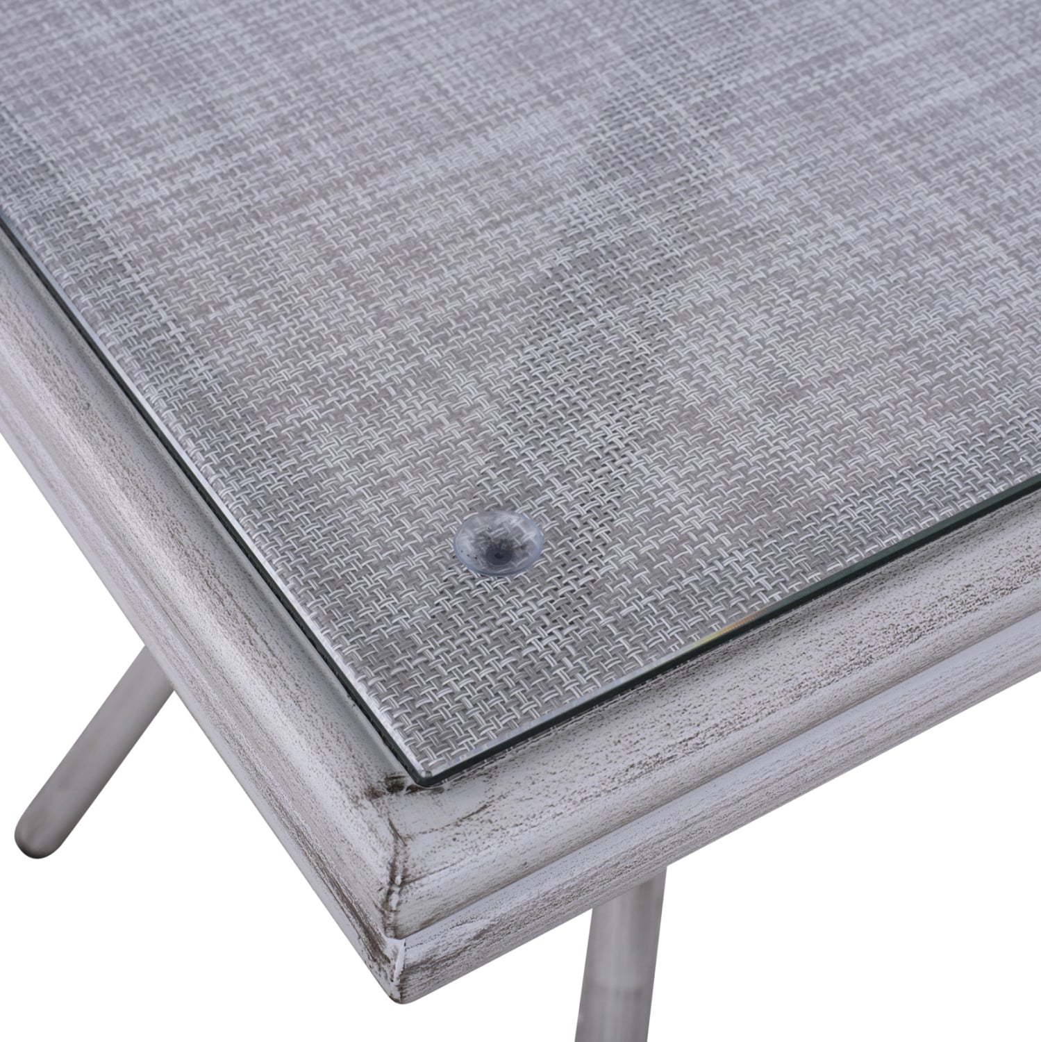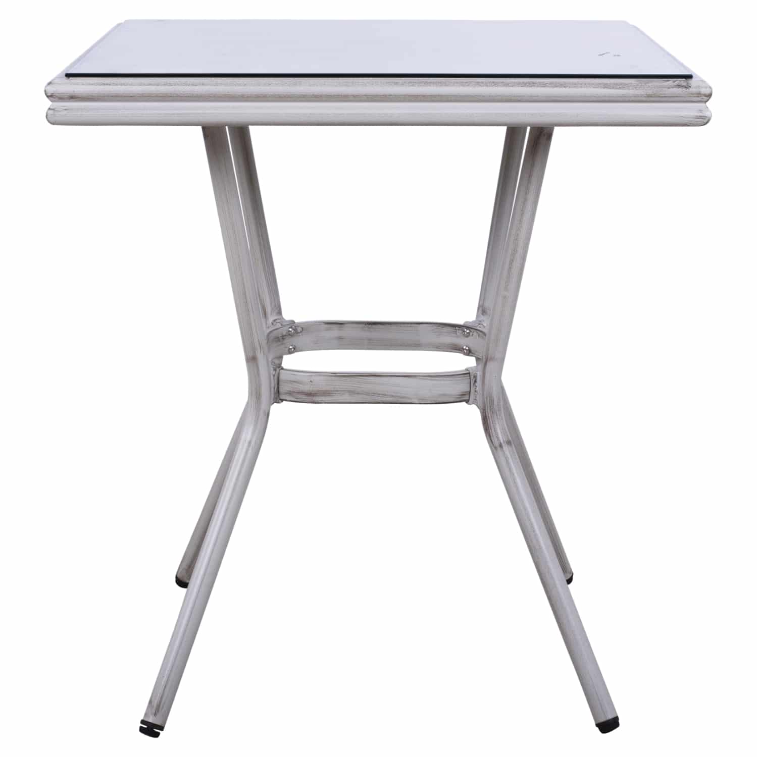 Τραπέζι αλουμινίου bamboo look σε λευκή πατίνα απόχρωση 70X70 εξωτερικού χώρου με textilene στην επιφάνειά του και ενσωματωμένο τζάμι.