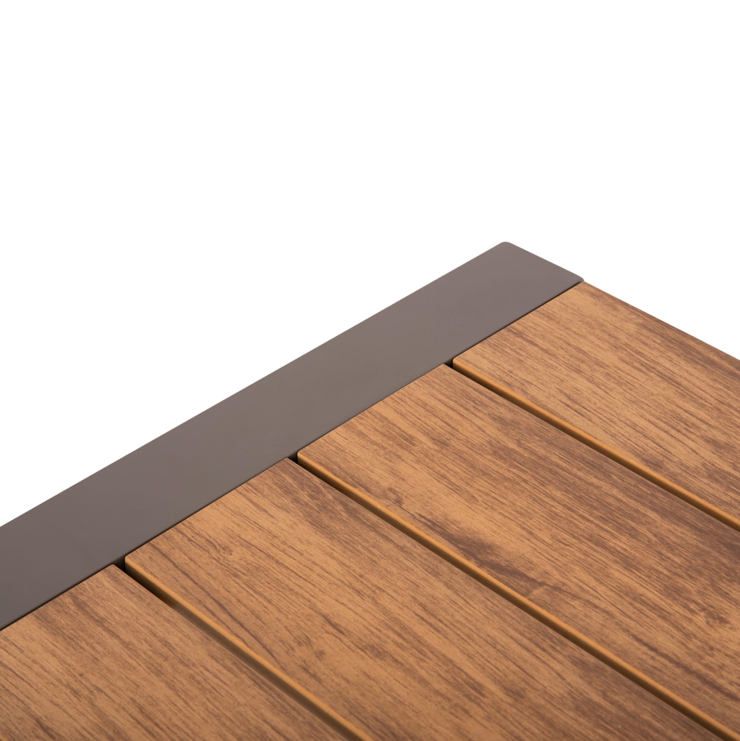 Το GOYA είναι ένα ορθογώνιο τραπέζι για εξωτερικούς χώρους με σκελετό αλουμινίου σε ΣΑΜΠΑΝΙ χρώμα. Η επιφάνεια είναι από πλάκες polywood σε ΦΥΣΙΚΟ χρώμα ξύλου. Πρόκειται για ένα απλό τραπέζι σε κανονική διάσταση, που μπορεί να εξυπηρετήσει 6 τουλάχιστον άτομα.