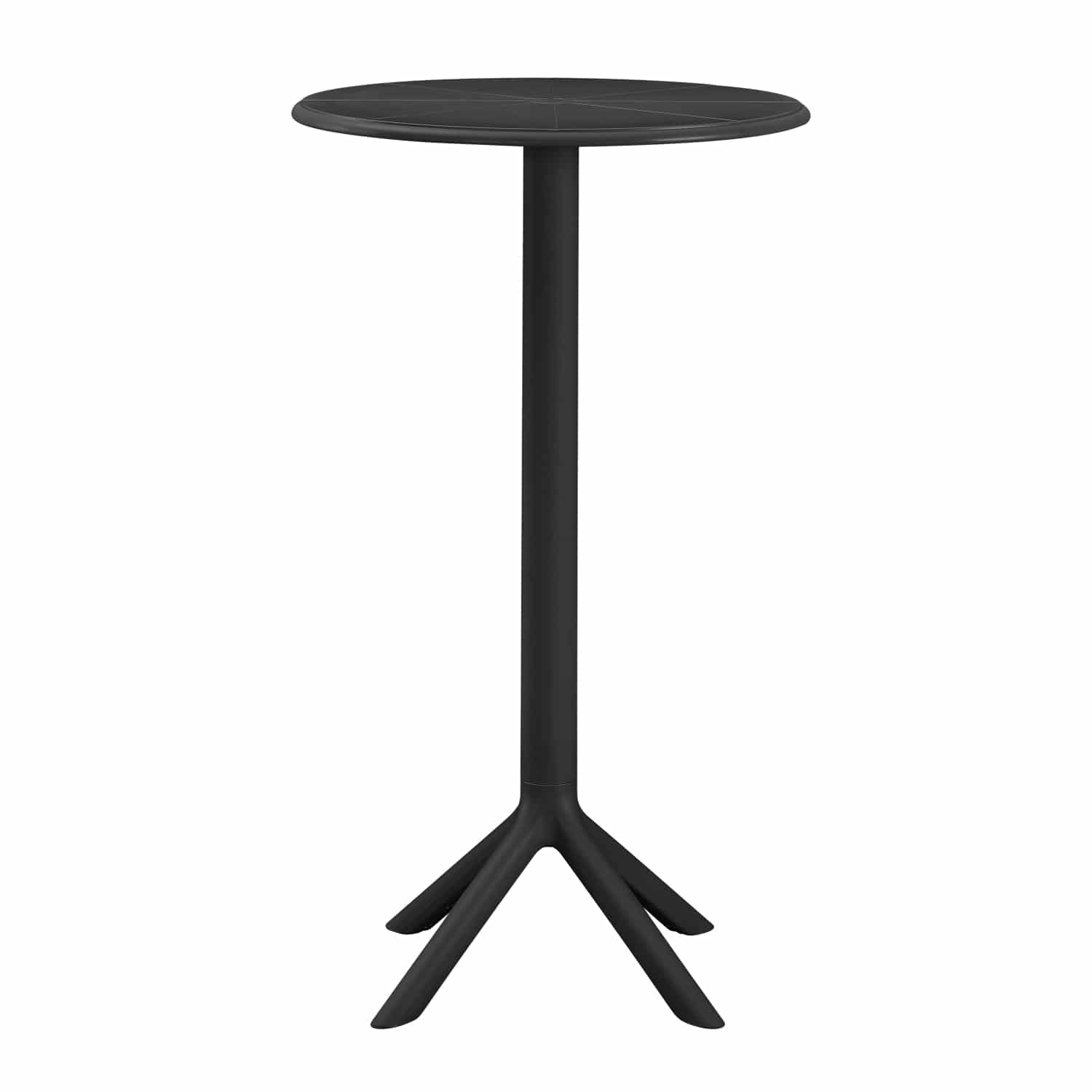 Το ψηλό τραπέζι για μπαρ πολυπροπυλενίου TERRIN σε ΜΑΥΡΟ χρώμα είναι η ιδανική πρόταση για χρήση σε εξωτερικούς χώρους, είτε επαγγελματικούς (κυρίως), είτε για το σπίτι. Το τραπέζι είναι στρογγυλό, ενώ η στήριξη γίνεται με μια κολώνα στο κέντρο που καταλήγει σε 4 πόδια («νύχια»).