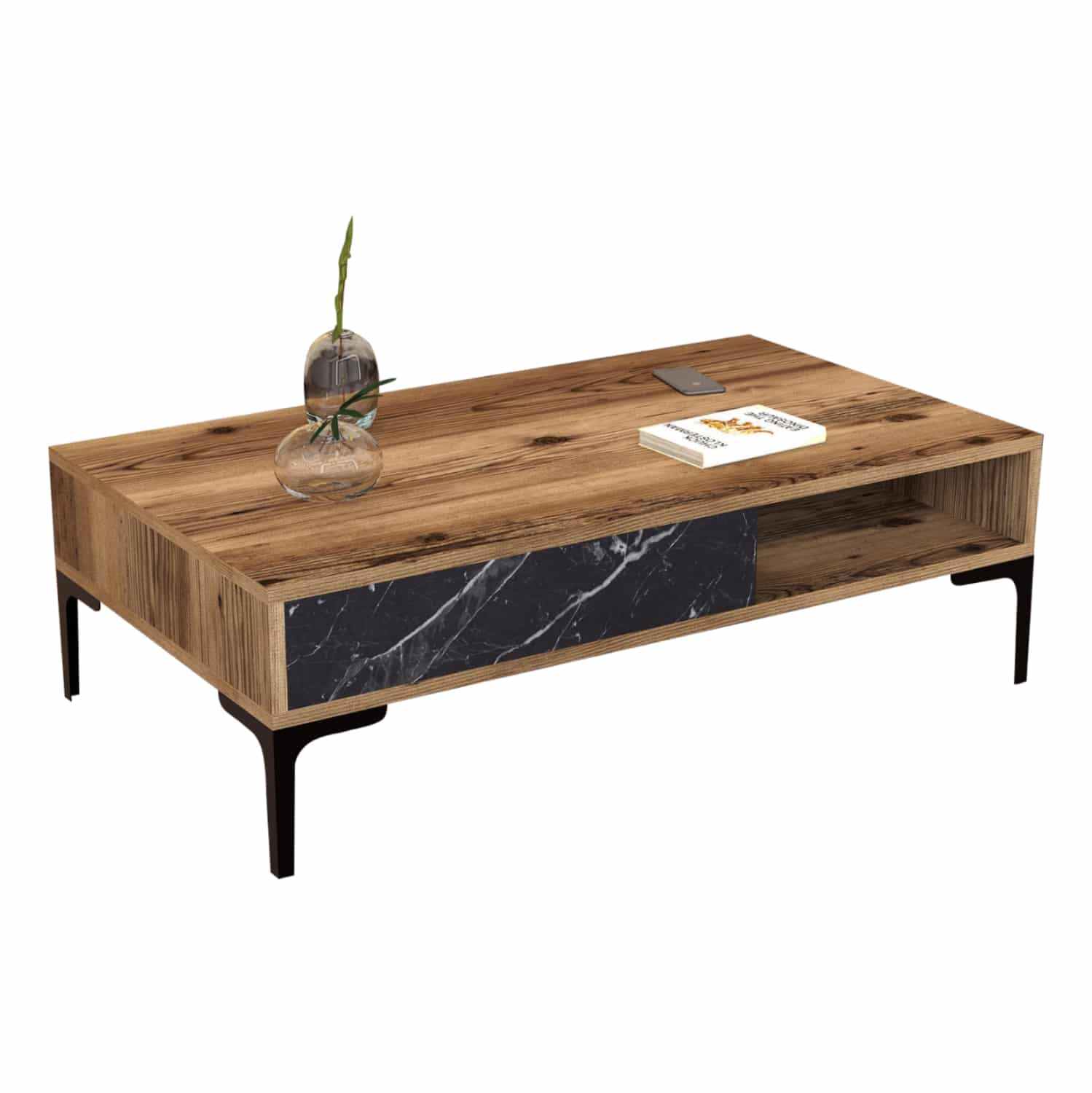 ΗΜ9503.04 τραπεζάκι σαλονιού—– Το τραπεζάκι αυτό είναι ένα όμορφο έπιπλο σε χρώμα καρυδί με πλαϊνό σε ΟΨΗ ΜΑΥΡΟΥ ΜΑΡΜΑΡΟΥ. Το πρακτικό του design θα αλλάξει την εικόνα του σαλονιού ή του καθιστικού σας προς το καλύτερο. Πρόκειται για μια κατασκευή με μια ικανοποιητικού μεγέθους επάνω επιφάνεια. Από κάτω υπάρχει ανοιχτός χώρος τοποθέτησης αντικειμένων κατά το ήμισυ. Η κομψότητα, η ποιότητα και το minimal πρακτικό design χαρακτηρίζουν αυτό το τραπεζάκι, που έχει φτιαχτεί για εσένα.