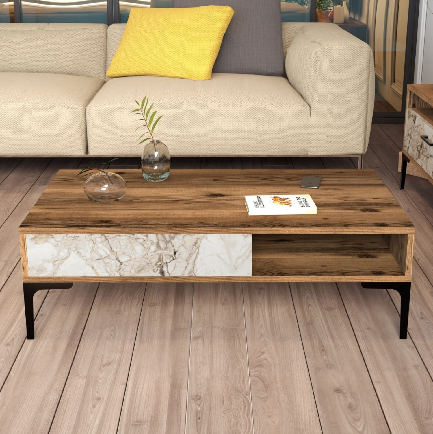 ΗΜ9503.05 τραπεζάκι σαλονιού—– Το τραπεζάκι αυτό είναι ένα όμορφο έπιπλο σε χρώμα καρυδί με πλαϊνό σε ΟΨΗ ΛΕΥΚΟΥ ΜΑΡΜΑΡΟΥ. Το πρακτικό του design θα αλλάξει την εικόνα του σαλονιού ή του καθιστικού σας προς το καλύτερο. Πρόκειται για μια κατασκευή με μια ικανοποιητικού μεγέθους επάνω επιφάνεια. Από κάτω υπάρχει ανοιχτός χώρος τοποθέτησης αντικειμένων κατά το ήμισυ. Η κομψότητα, η ποιότητα και το minimal πρακτικό design χαρακτηρίζουν αυτό το τραπεζάκι, που έχει φτιαχτεί για εσένα.